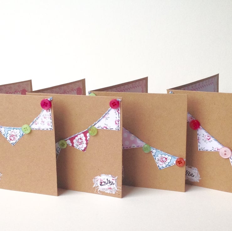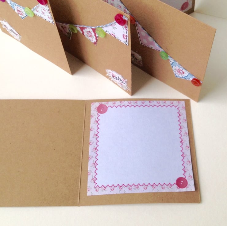 They feature a vintage, cottage rose design, printed card and the design itself is of bunting and buttons. They each have a little hand written message saying, 'A Note'