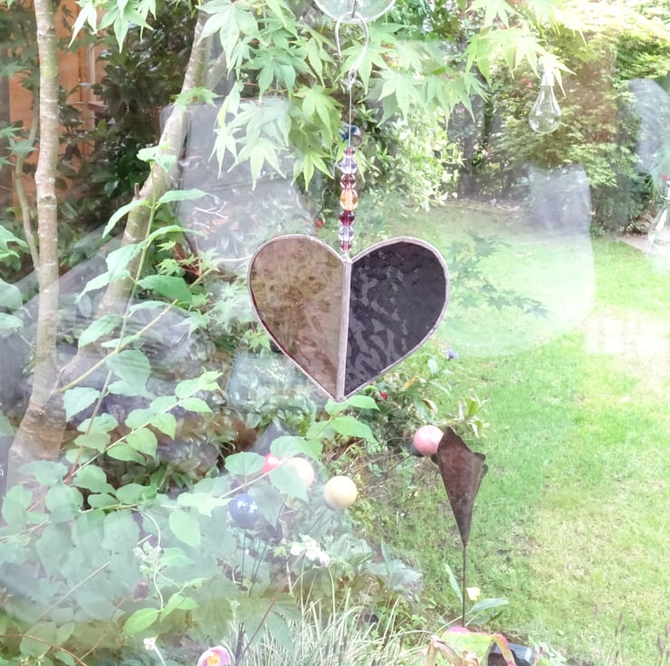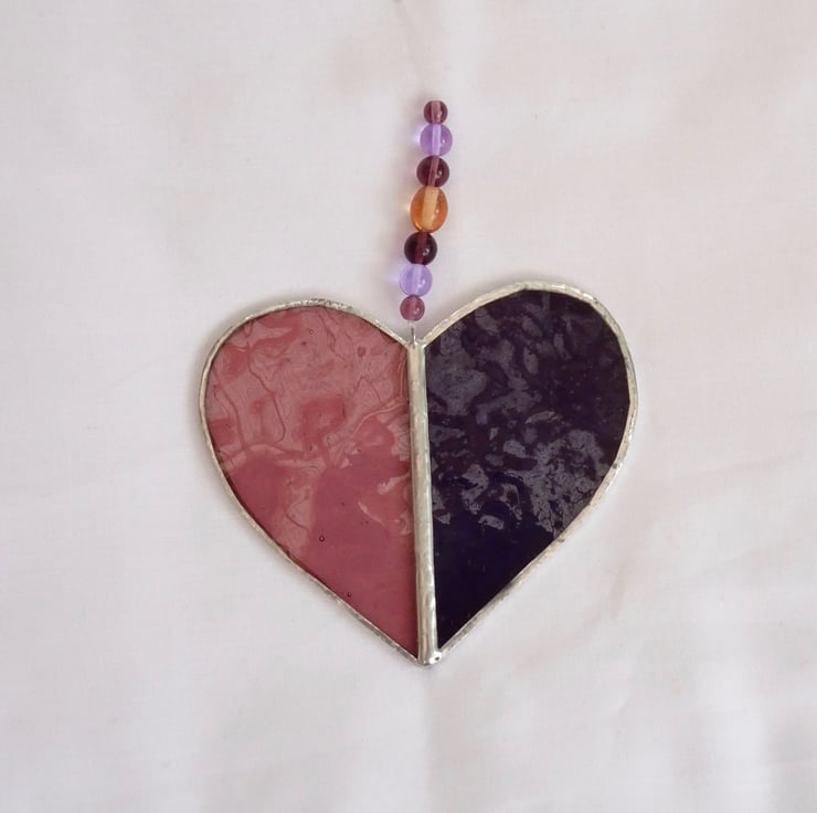 The glass used in this sun catcher is purple corella glass and pink textured glass. Each piece of glass has been copper foiled and soldered together.