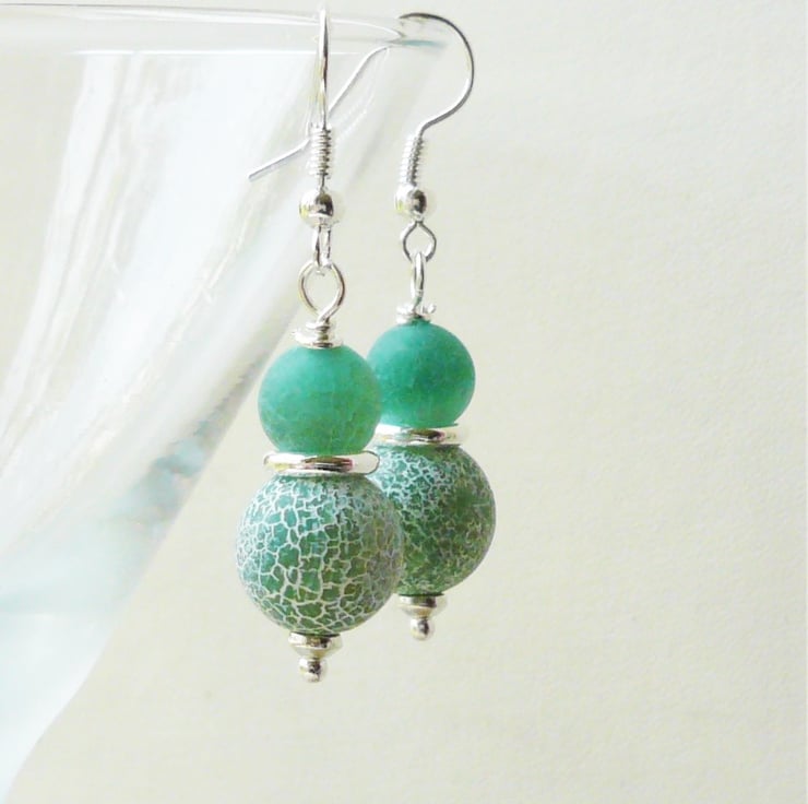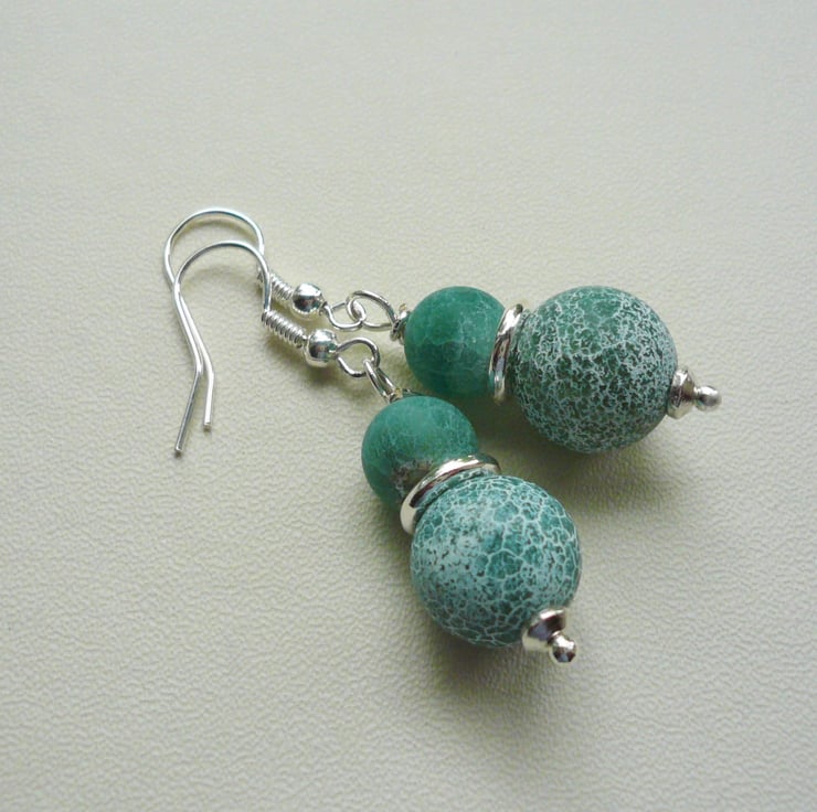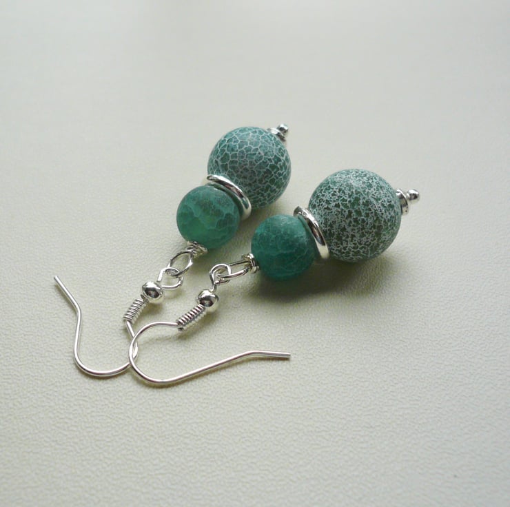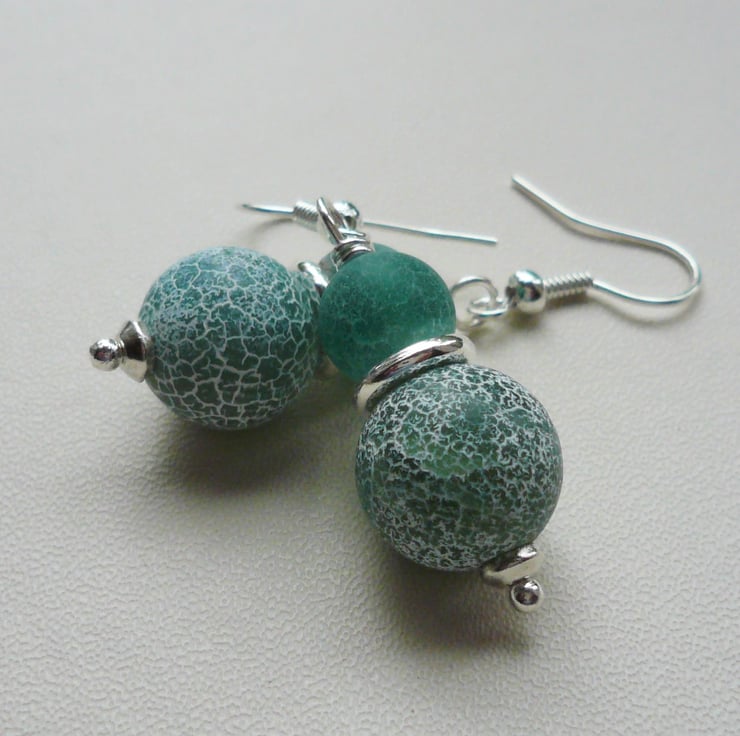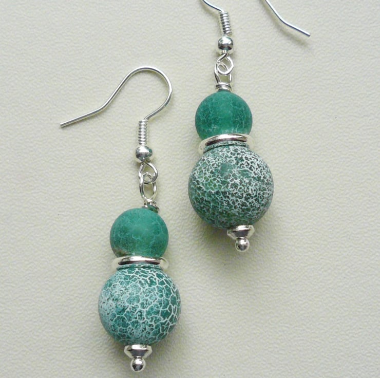 These pretty earrings are made up of 6mm and 10mm round frosted cracked Agate beads in two shades of teal/turquoise blue. Together with Tibetan silver ring spacers and bead caps they hang from silver plated ear hooks. Total length incl hook is approx 4.5cm.