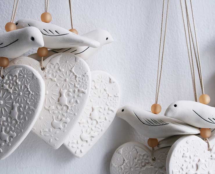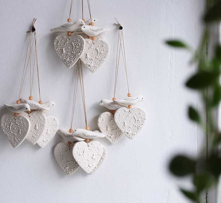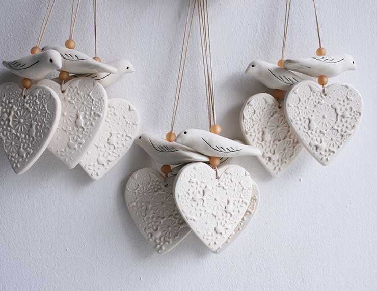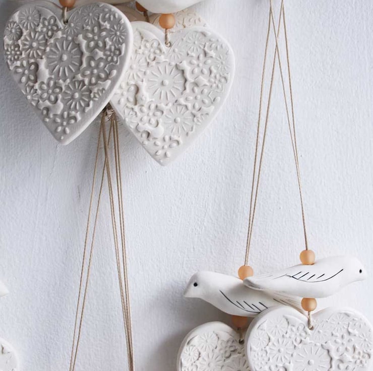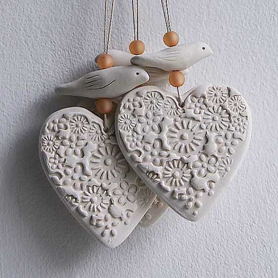 Heart and hand sculpted bird. The heart has been impressed with floral decoration and the small bird has incised wings and eyes.