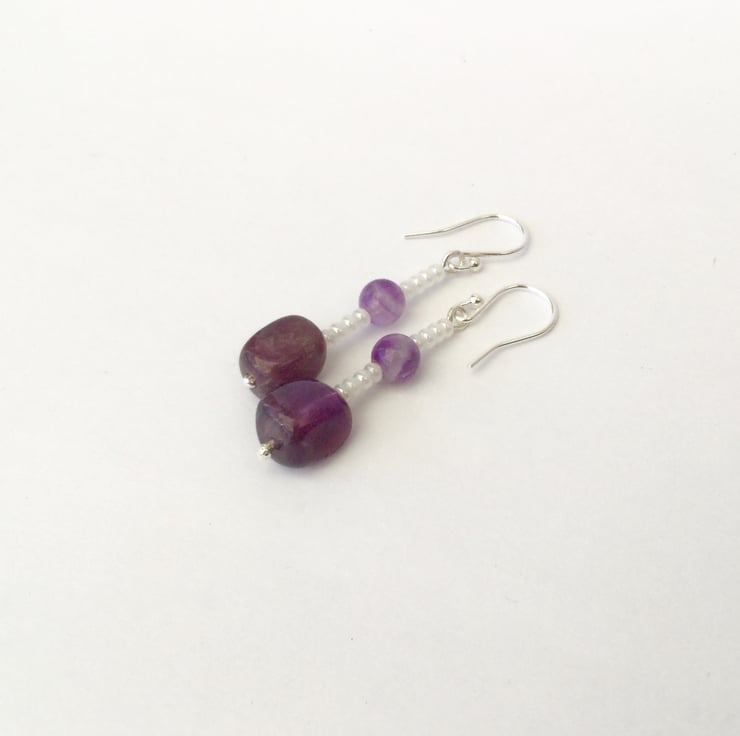 These lovely gemstone and silver earrings feature nuggets of deep purple amethyst together with lavender coloured amethyst beads and pearly white seed beads. Amethyst is the birthstone for February. They are mounted on handmade sterling silver head pins and dangle from simple but elegant ear hooks, stamped 925 for sterling. The drop below the hook is about 3.5cm, 11/2inches. A matching necklace and bracelet are available from my Folksy shop - see last photo.