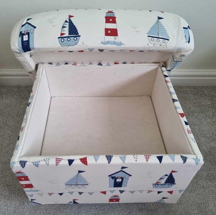 It measures approximately 40cm high, by 50 cm wide & 48 cm depth, and is fitted with solid wooden feet, and has a lovely deep storage area inside. It is strong enough to be used as an extra seat or as a coffee table and meets all UK fire regulations.
