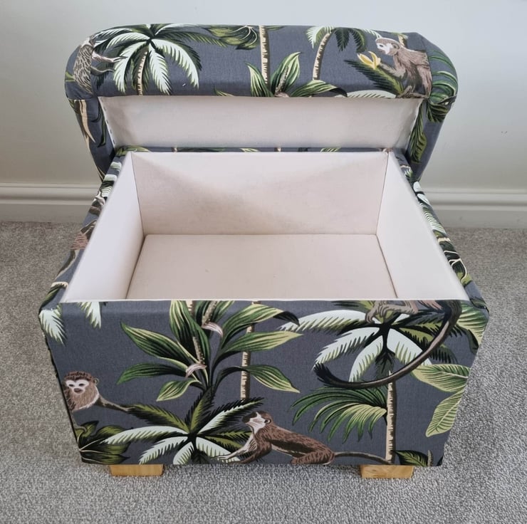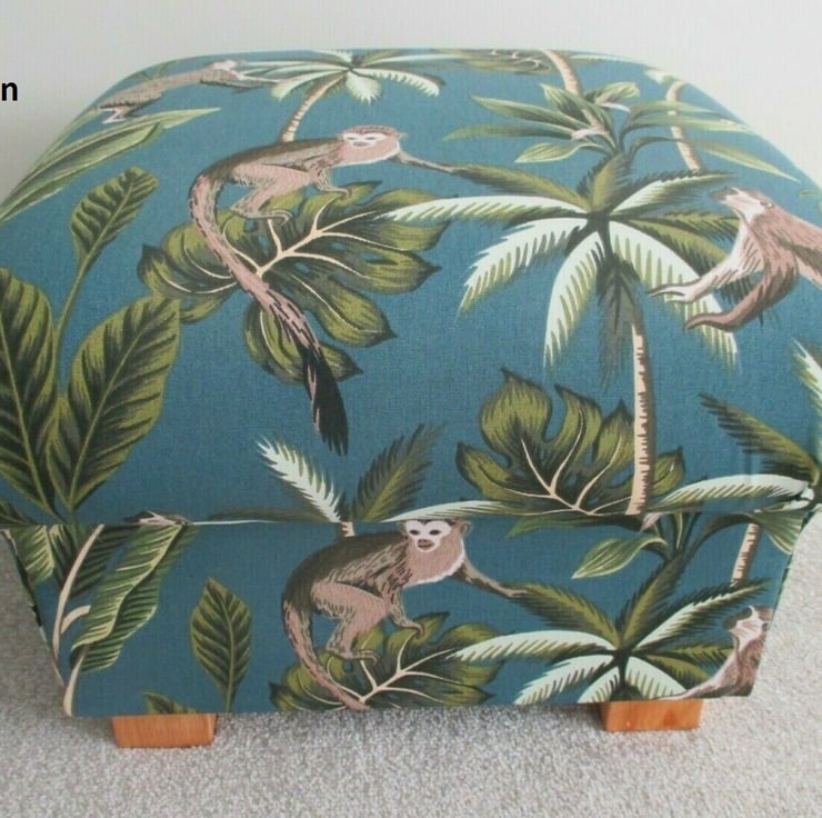 I am a professional upholsterer with over 33 years experience, and have handmade this storage footstool using Fryetts Monkeys Teal fabric.