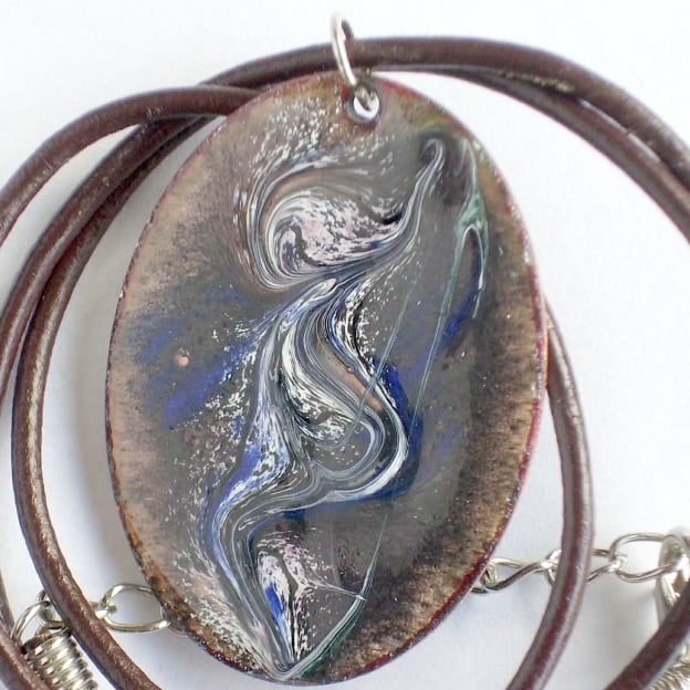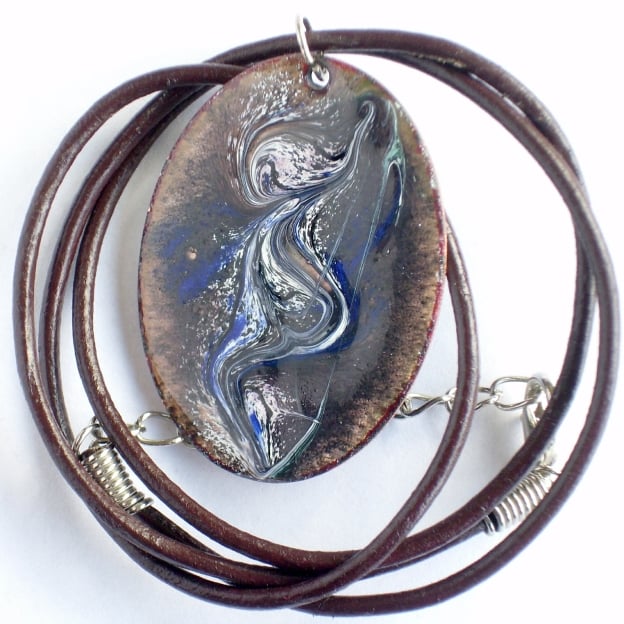 I have made this pendant by scrolling a random pattern of white, pink and blue enamel on black over a base coat of clear enamel. The clear enamel allows the copper base to show through, golden brown. I have counter enamelled the copper base on which the enamel is laid.