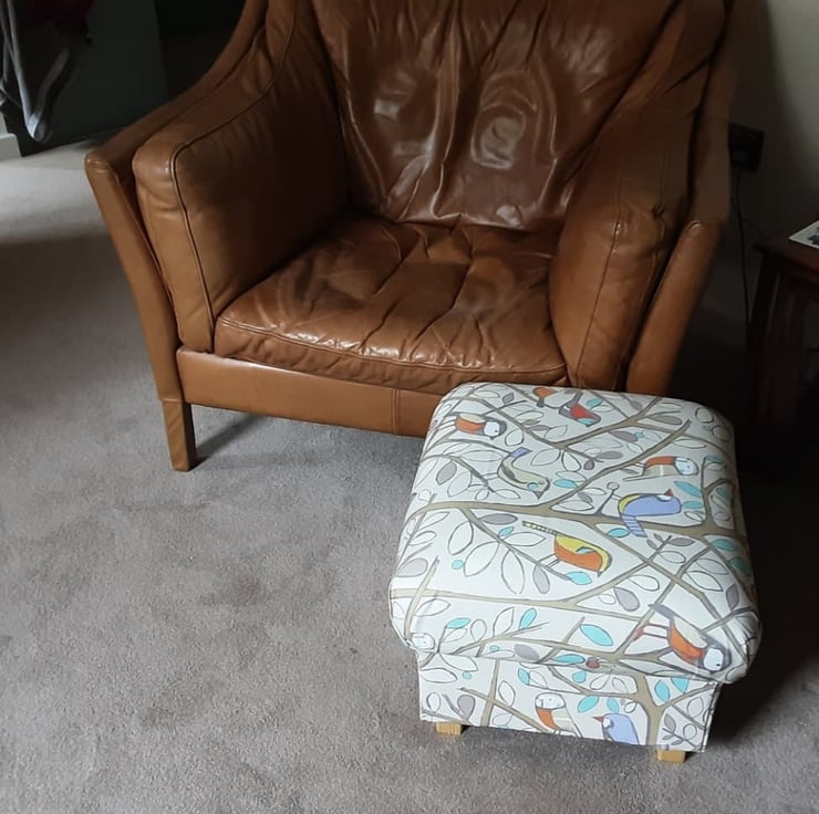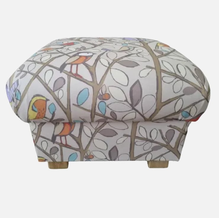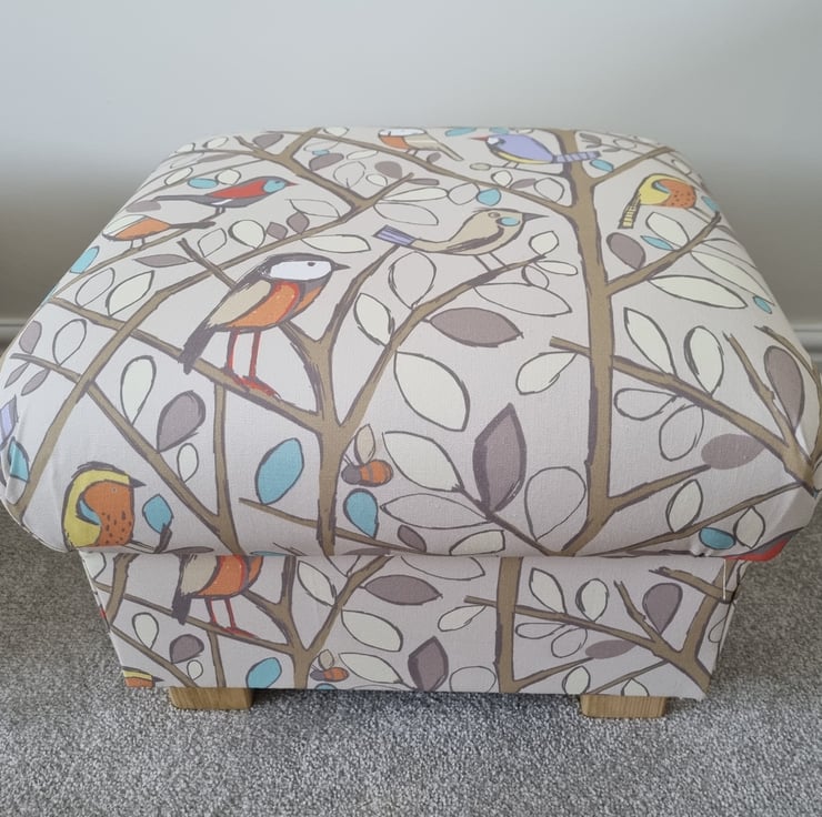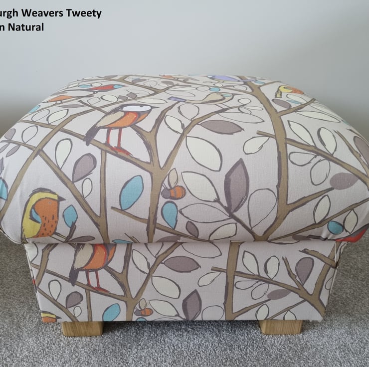 I am a professional upholsterer with over 33 years experience, and have handmade this storage footstool using Edinburgh Weavers Tweety Birds Natural fabric.