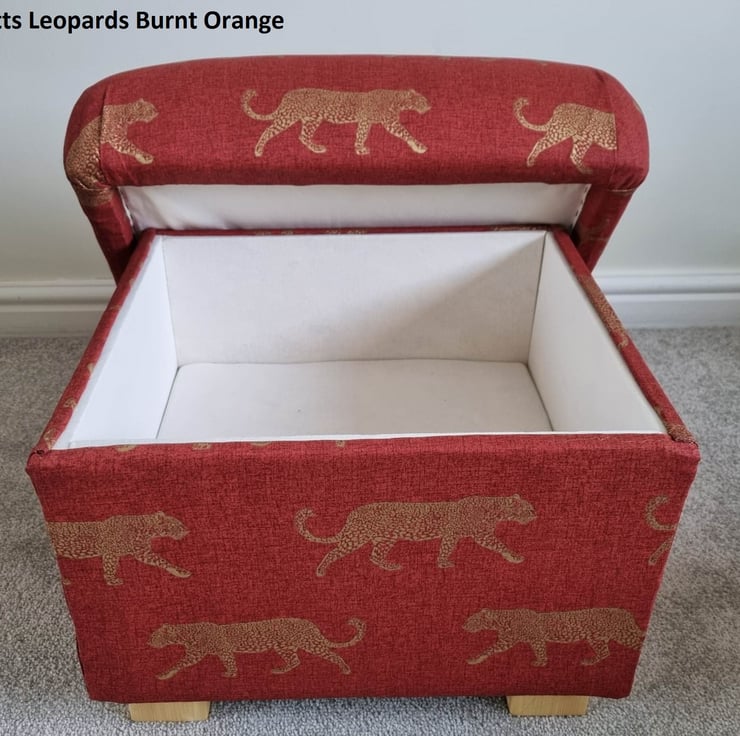 It measures approximately 40cm high, by 50 cm wide & 48 cm depth, and is fitted with solid wooden feet, and has a lovely deep storage area inside. It is strong enough to be used as an extra seat or as a coffee table and meets all UK fire regulations.