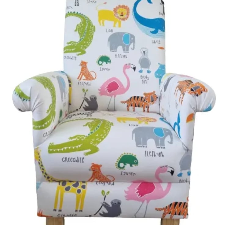 I am a professional upholsterer with over 33 years experience, and have made this sturdy little CHILD’S chair, using Harlequin Scion Animal Magic fabric in Tutti Frutti colourway.