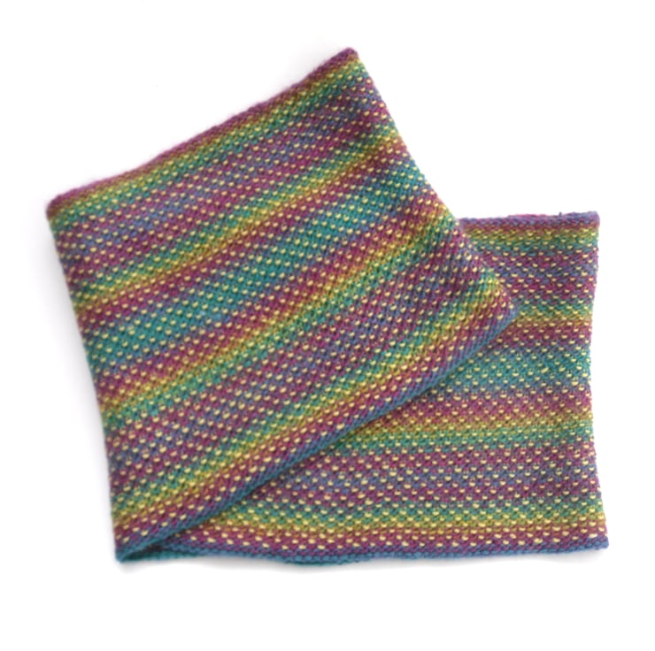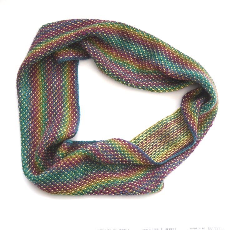 Colourful long infinity scarf knitted in a linen stitch pattern. Hand knit in 2 different yarns, both acrylic / wool mix yarn.