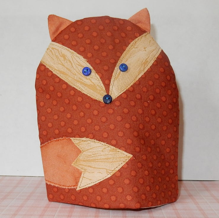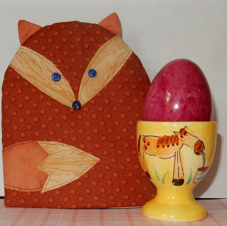 This fun item is a generously sized egg cosy, which will fit any egg cup. It measure approx. 5.5 inches high x 4.5 inches wide and is made from a spotted cotton fabric, which has been appliqued to make a fox. There is a layer of wadding and a plain lining. It has buttons for nose and eyes, so not suitable for young children.