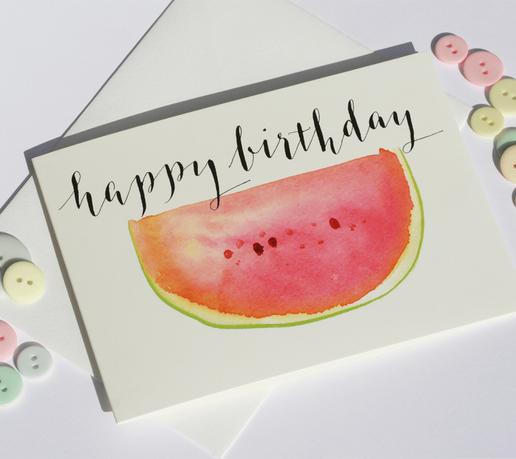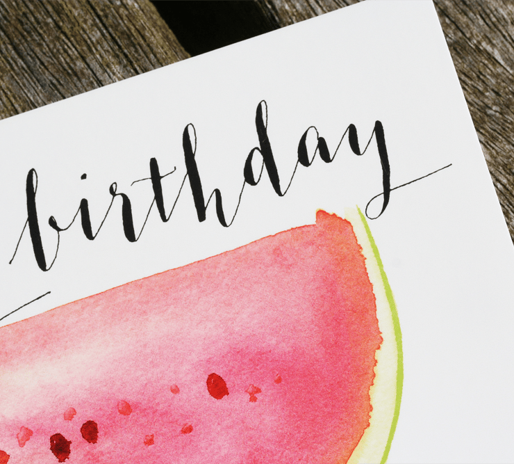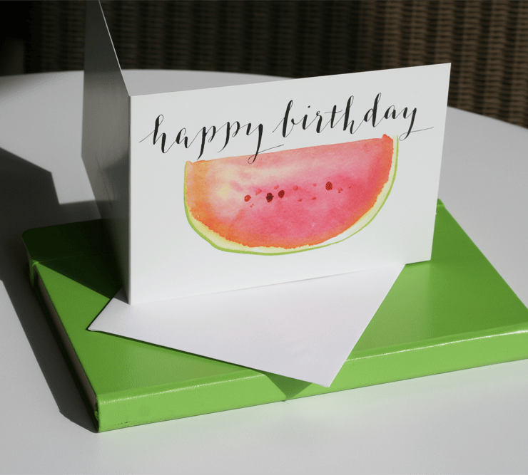 A pack of two 148 x 105 mm (A6) birthday greetings cards, featuring a quirky, summery watermelon watercolour design and contemporary calligraphy.