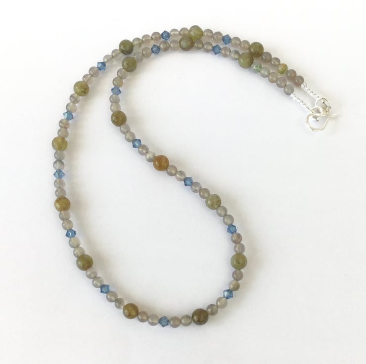 This versatile necklace combines labradorite beads with dove grey agate, Swarovski crystal and sterling silver. It is discreet enough for everyday wear but has a bit of sparkle for the evenings. The labradorite is predominantly moss green in colour with some brown and gold. In bright light there are magical flashes of blue iridescence. To accentuate these blue flashes I have added Swarovski crystal beads in denim blue. The hook and ring clasp is handmade by me from sterling silver. The beads are threaded on strong beading wire and finished with a few seed beads. The length of the necklace is 49cm, 191/2inches. The labradorite beads are 6mm and the others 4mm in diameter. This necklace will be packaged in a smart gift box and sent by Royal Mail first class post.