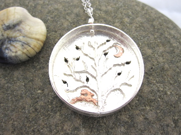 Hare & Tree Scenic pendant, copper Hare & leafy blossom silver tree. Silver Hares Pendant