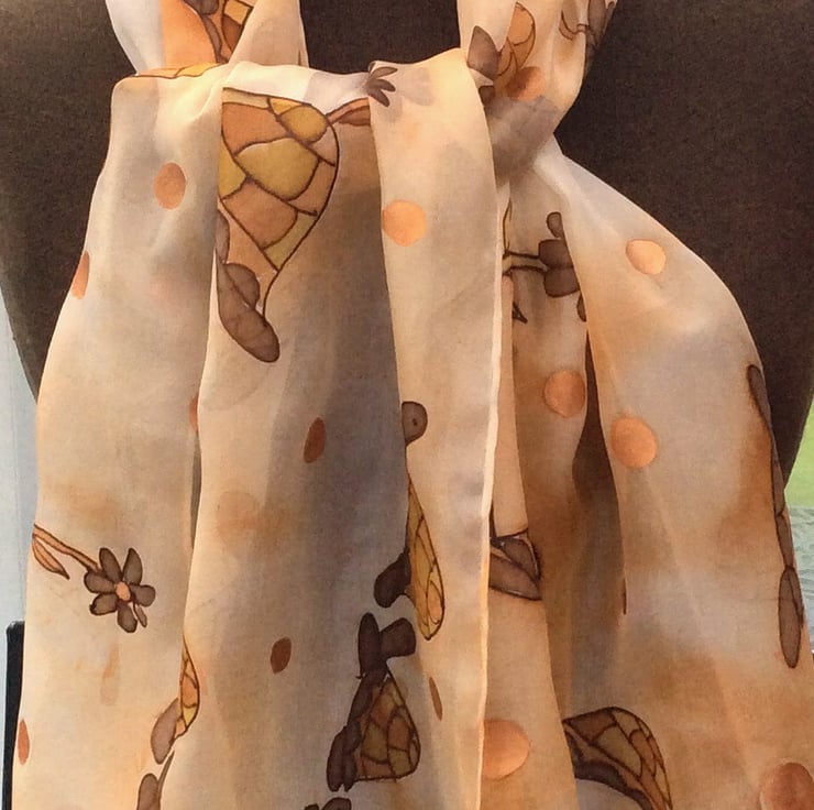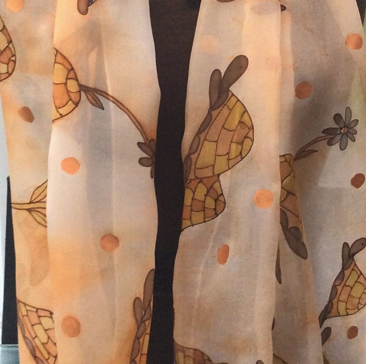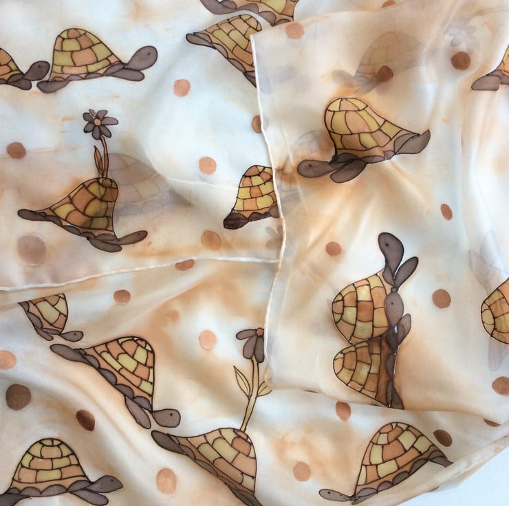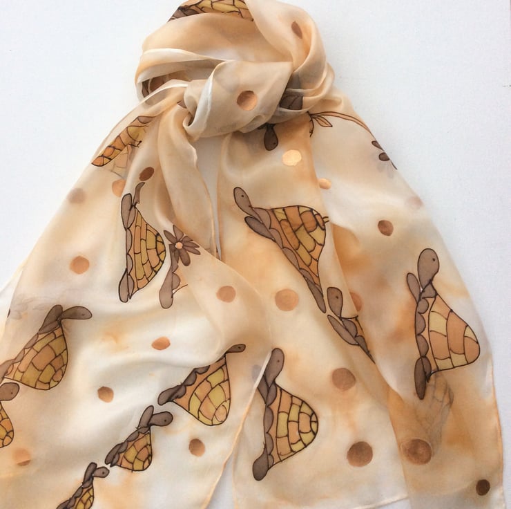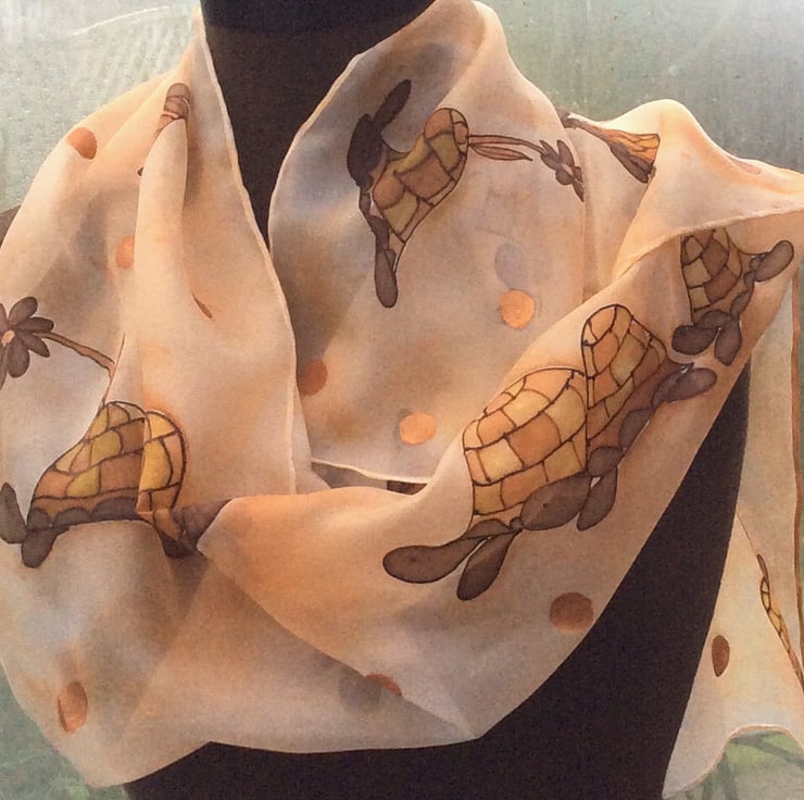 Hand painted silk scarf in a fun Tortoise design. The brown and ochre tortoises are on a pale peach speckled background with bronze spots throughout the design. Each scarf is painted freehand on hand rolled Ponge 5 silk which is soft and light and drapes beautifully. My scarves are all washed and ironed after painting. This one measures 40 x 150cm (approx 16 x 60 inches), it is 100% colourfast and washes beautifully by hand. It is signed and packaged in a colourful gift bag.