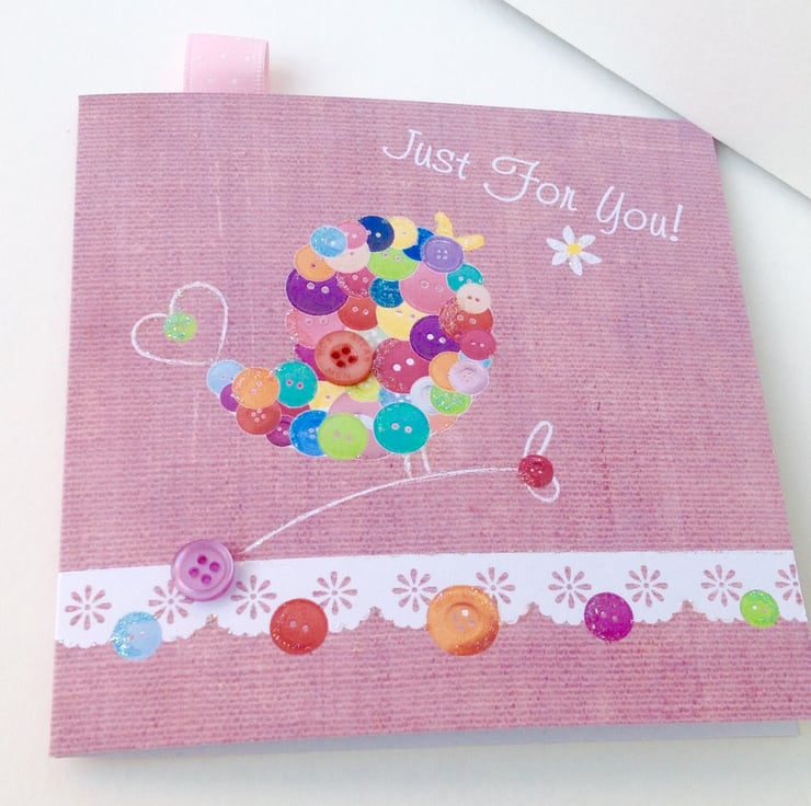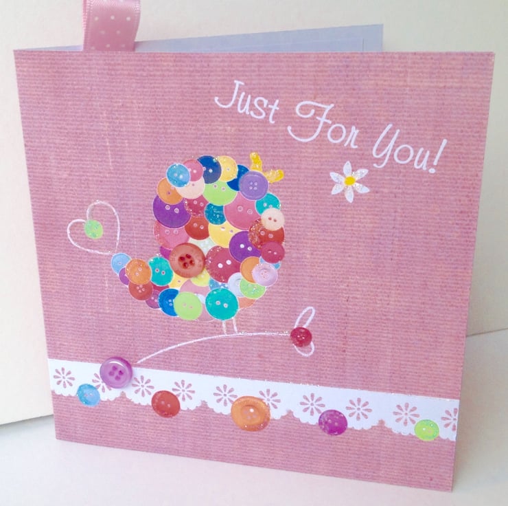 The card features a bird image, filled with buttons and a birthday greeting, finished off also with a hint of glitter.