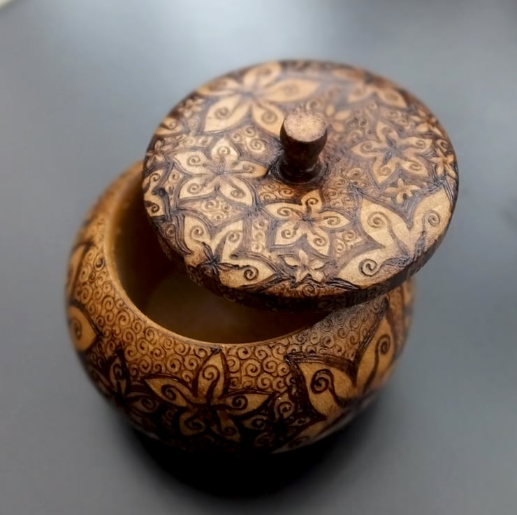 This is a listing for a tiny delicate trinket pot, adorned with flowers and swirls. It is decorated using pyrography.