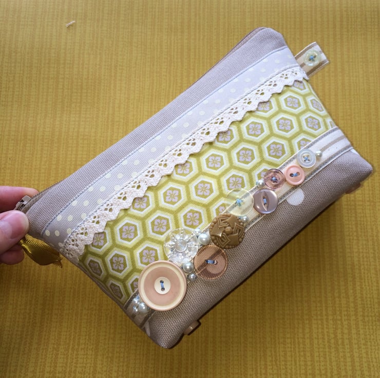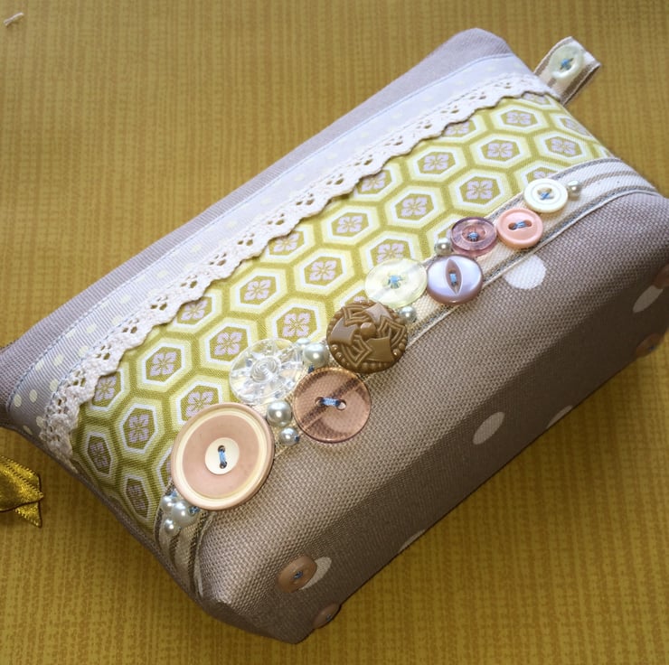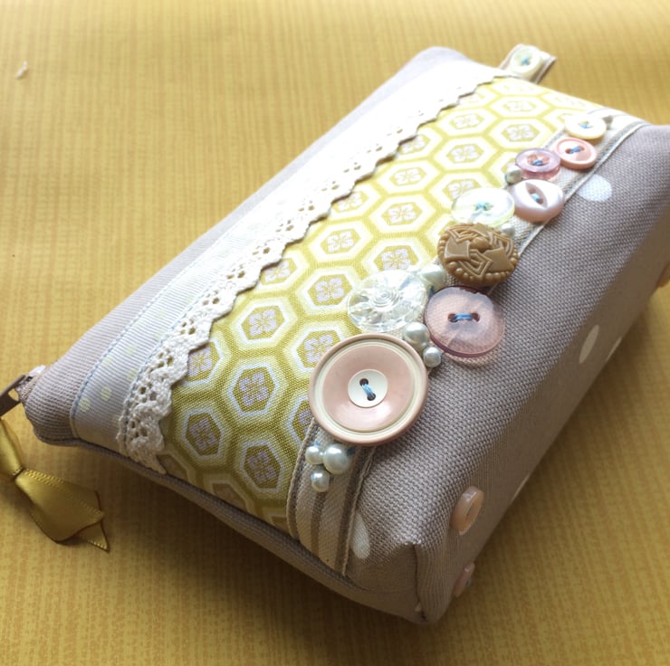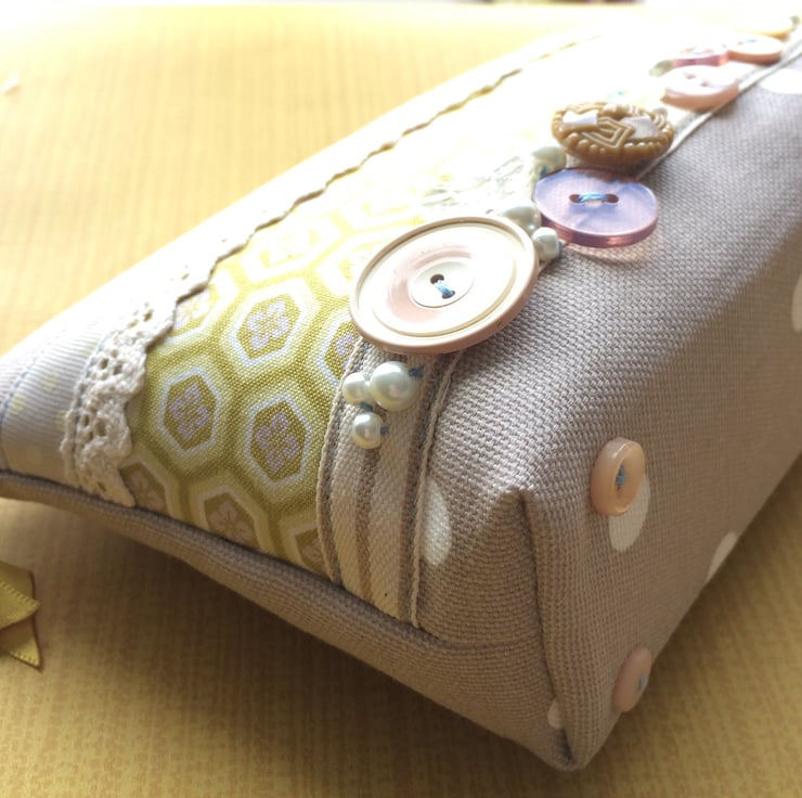 Handmade dotty large beauty bag embellished with vintage buttons, spotty and striped ribbons and vintage style fabric trim.