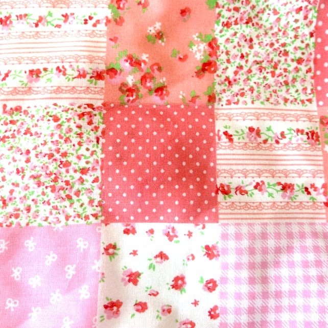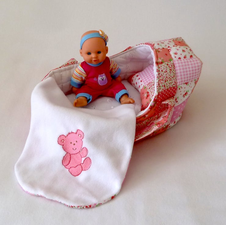 This pretty doll's carrycot is made from polyester cotton which has a patchwork design. It is lined with white broderie anglaise and polyester wadding.