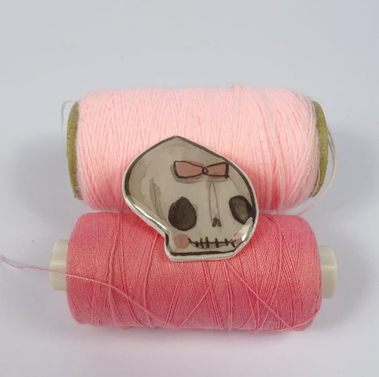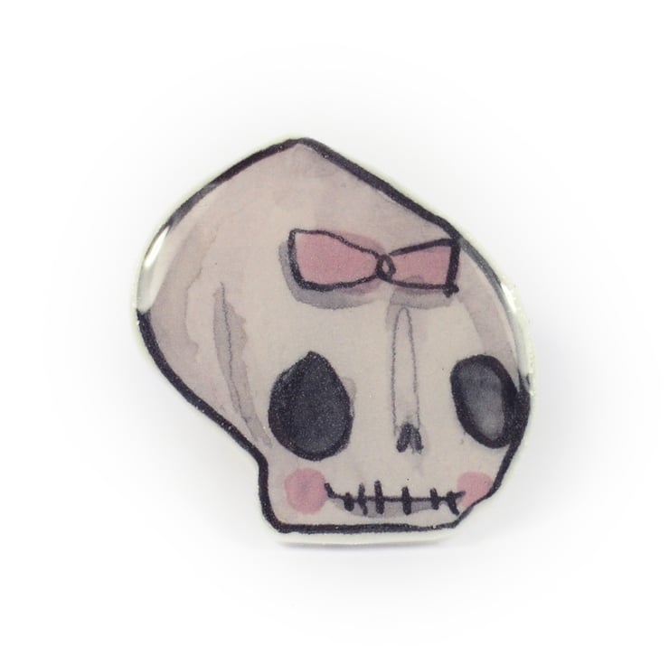 This listing is for a cute girlie skull brooch. The second image shows other girlie skulls in the collection.