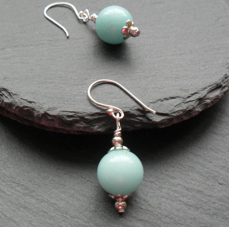 Quartzite beads with silver tone bead caps are attached to silver plated copper ear wires