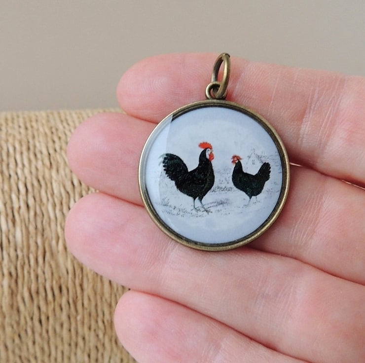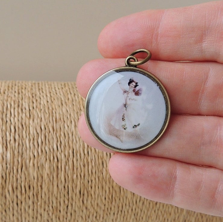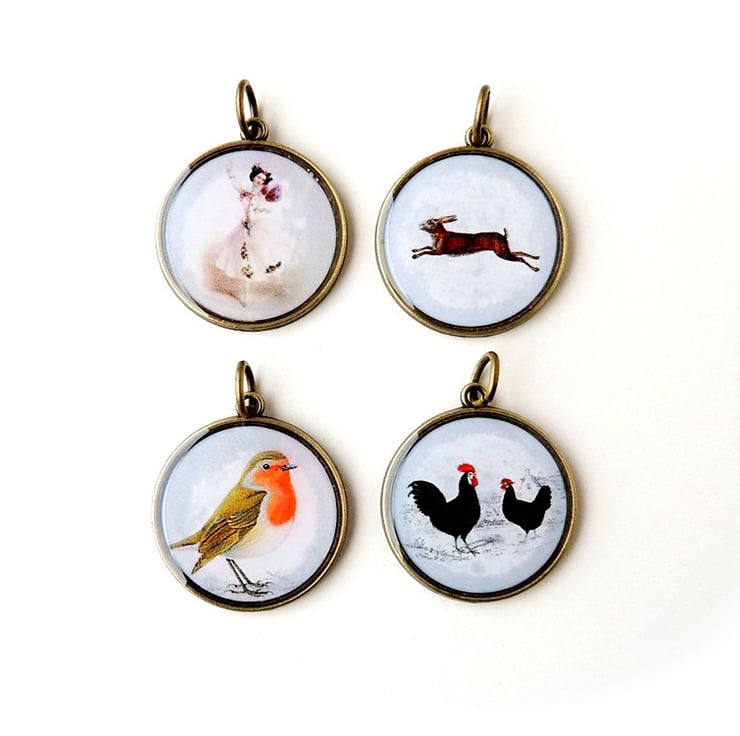 Each pendant is made with an image of a vintage illustration that I've set into an antique bronze plated pendant bezel and sealed it with a coat of clear resin.