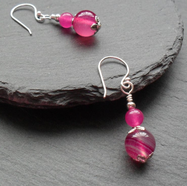 Deep pink agate with silver coloured bead caps which give decoration around the beads are attached to silver plated copper ear wires