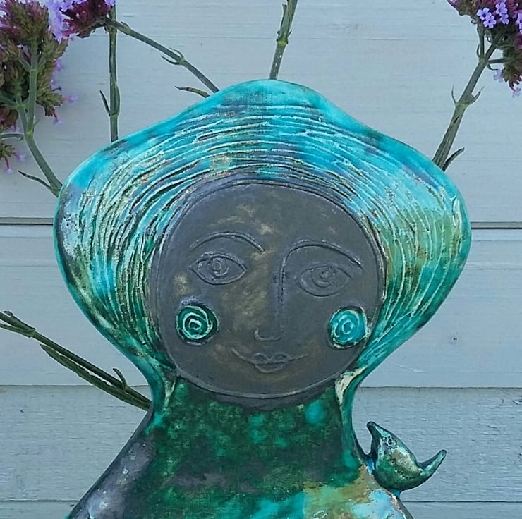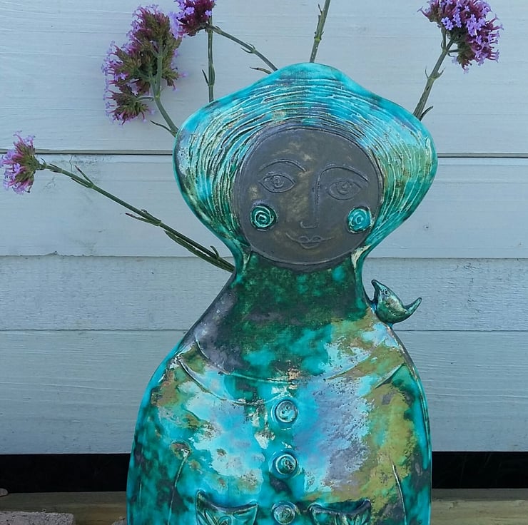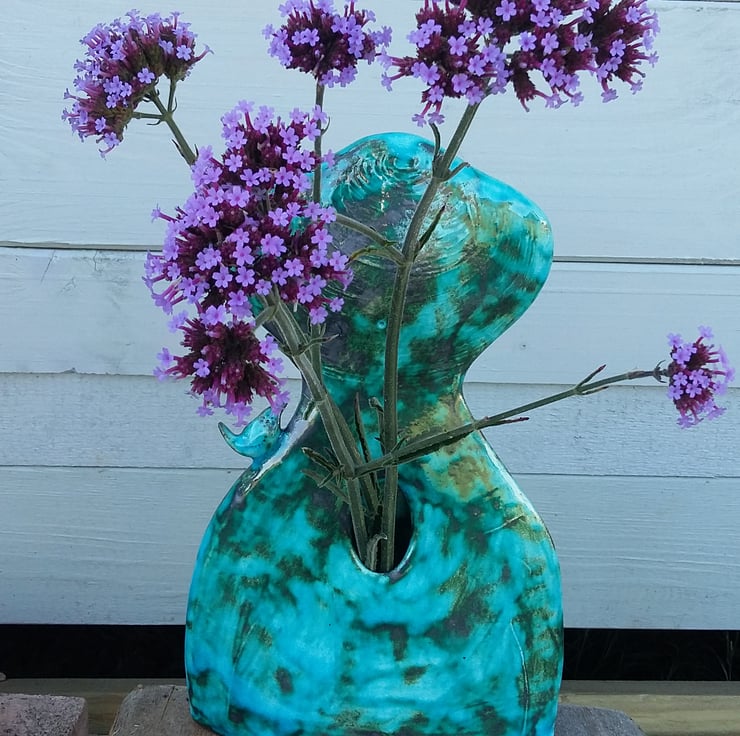 Handmade in earthenware clay this figurative vase with a small bird measures 25cm high and is finished in a bright green and turquoise glaze .Although the vase is glazed on the inside,filling with water is not recommended. But is perfect for dried flowers or grasses.