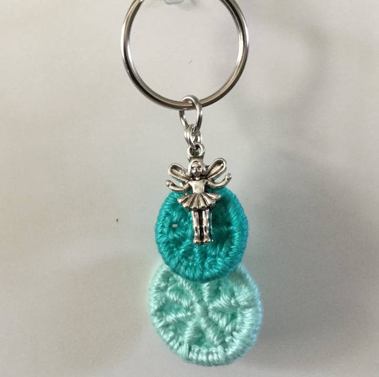 This pretty keyring bag charm has two Dorset buttons which I have made in a 100% cotton yarn. The largest button is in a light turquoise on a 25mm brass ring, the smaller button is in a darker turquoise on an 18mm brass ring.