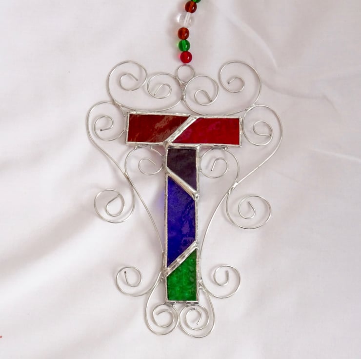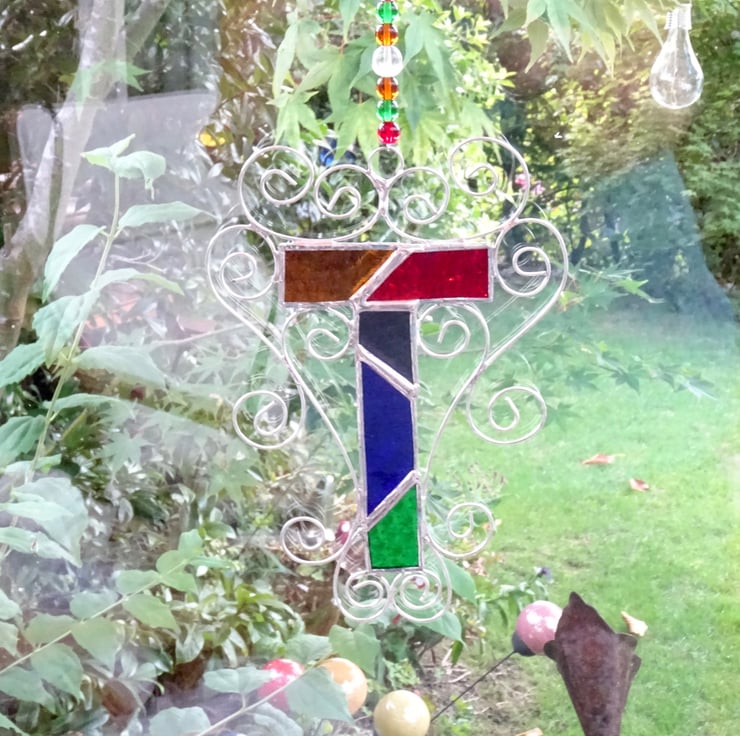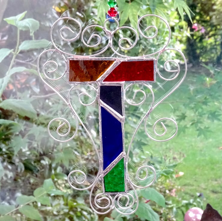 This letter has been made from different types vibrantly coloured stained glass. Each piece of glass has been hand cut, ground, foiled, and soldered together, washed and polished. Twisted tinned wire is added for extra interest. A ring, length of beaded fishing line and a hook has been attached for hanging purposes.