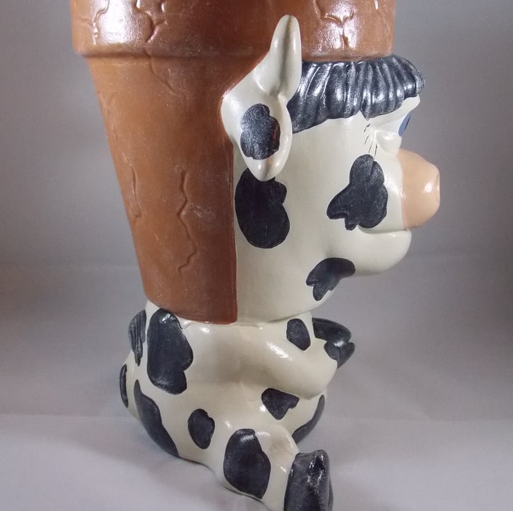 I have for sale a novelty ceramic plant pot, which was hand painted by myself. It is from a range called 'Waddle Pots', this one is a black and white cow. The back part of its head is the plant pot, which is in a terracotta colour. This pot has no drainage holes in the bottom of it, so it could be used indoors or out. This would make a fun and novel addition to anyone's home or garden, or perhaps given as a gift.