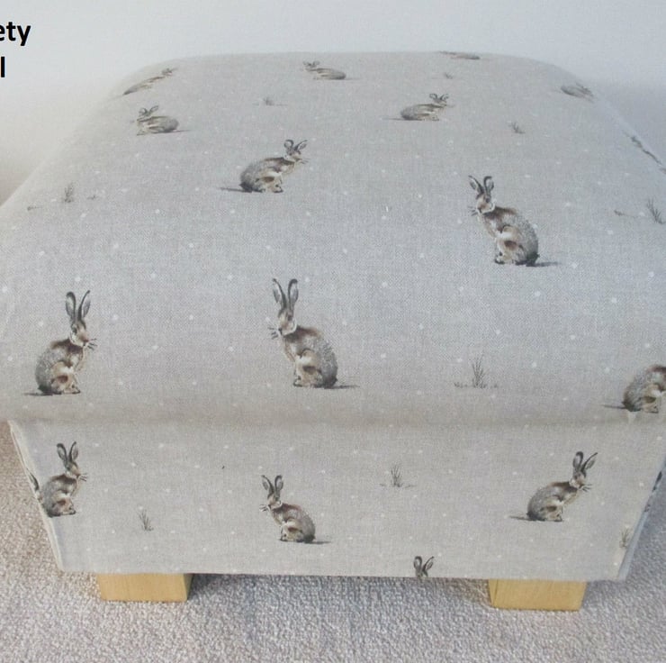 This is a sturdy handcrafted storage footstool which has been made by me, a professional upholsterer with 32 years experience, using this pretty Fryetts Hartley Hare fabric.