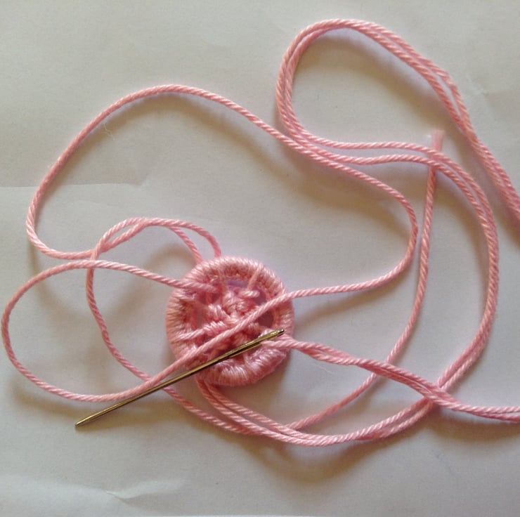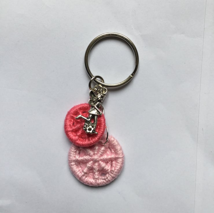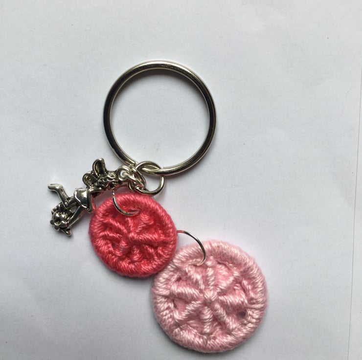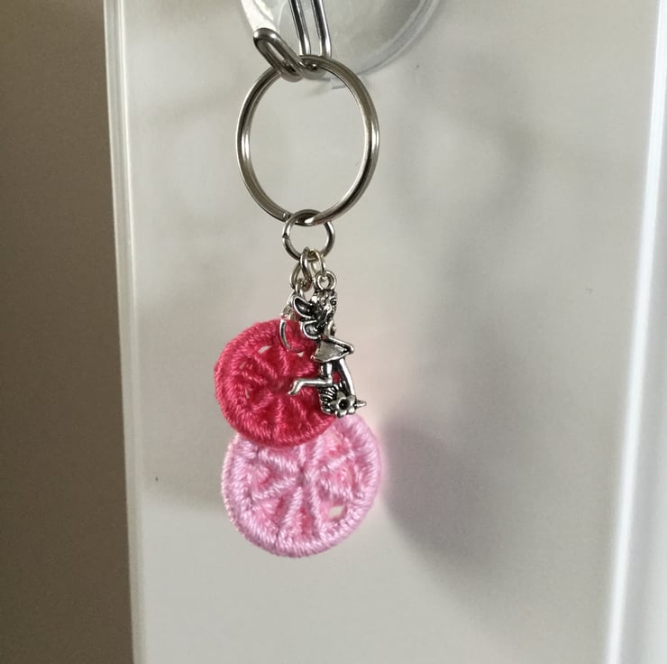 This pretty keyring has two Dorset buttons which I have made in a 100% cotton yarn. The largest button is in a pale pink on a 25mm brass ring, the smaller button is in a bright pink on an 18mm brass ring.