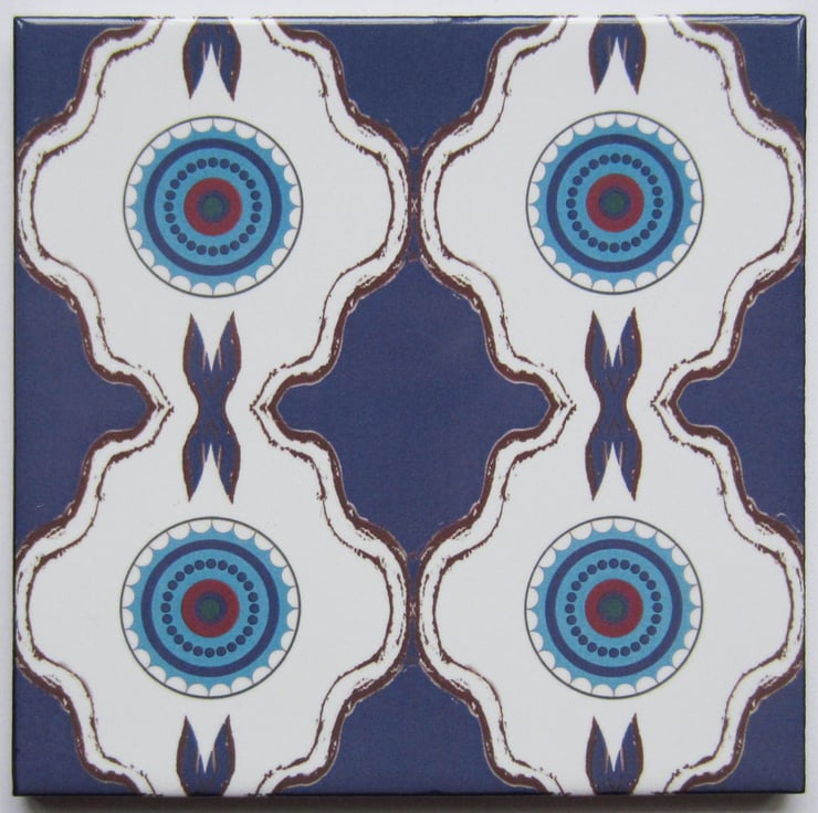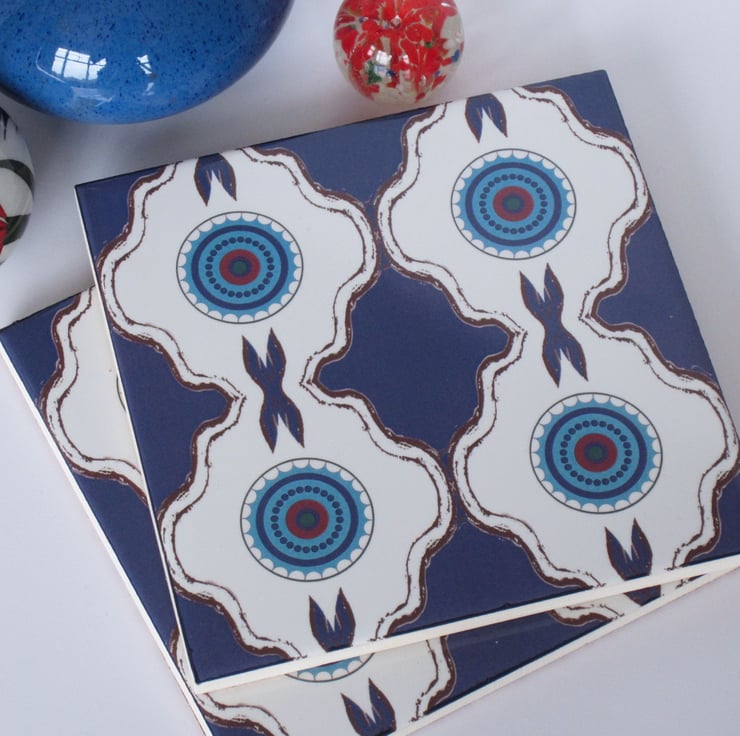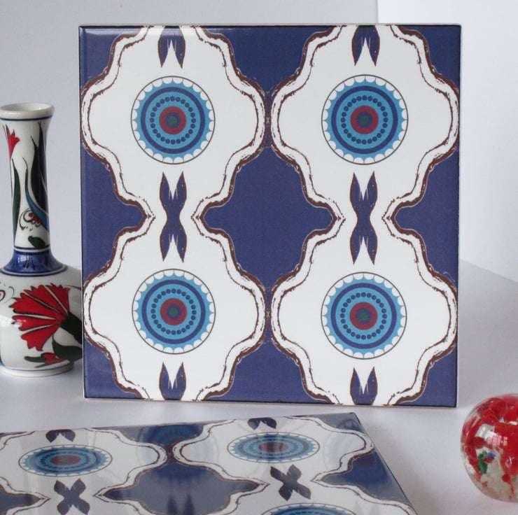 Deep Blue North African Inspired Geometric Ceramic Tile Trivet with Cork Backing