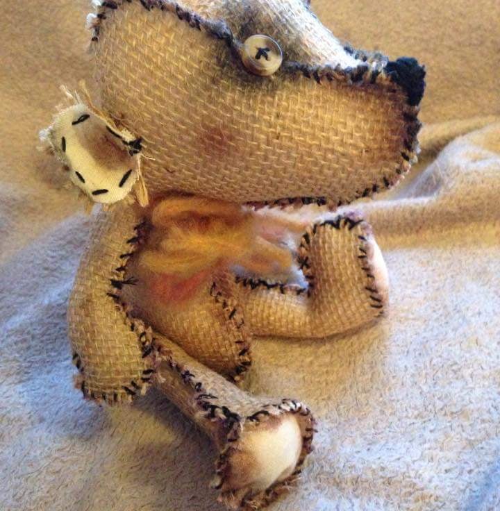 Old Ted is a true artist bear, he is made of hessian offcuts, bits of scrap calico and some discarded buttons. He was a labour of love to create and I hope that he can find a home that will love him completely.