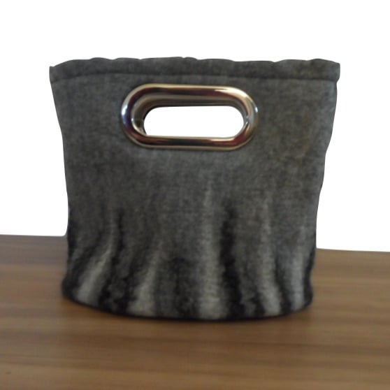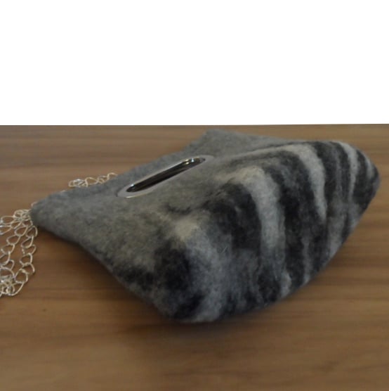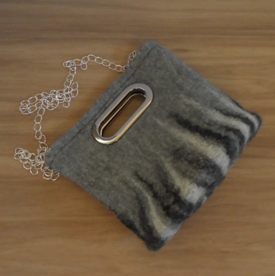 This bag has been felted using natural grey merino wool with black and white merino wool fibres used for decoration. It has been felted over a resist resulting in a seamless bag. Silver coloured eyelet style handles have been added along with a silver coloured chain shoulder strap. The shoulder strap is attached by means of clips allowing it to be removed and reattached at will.