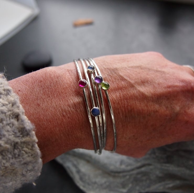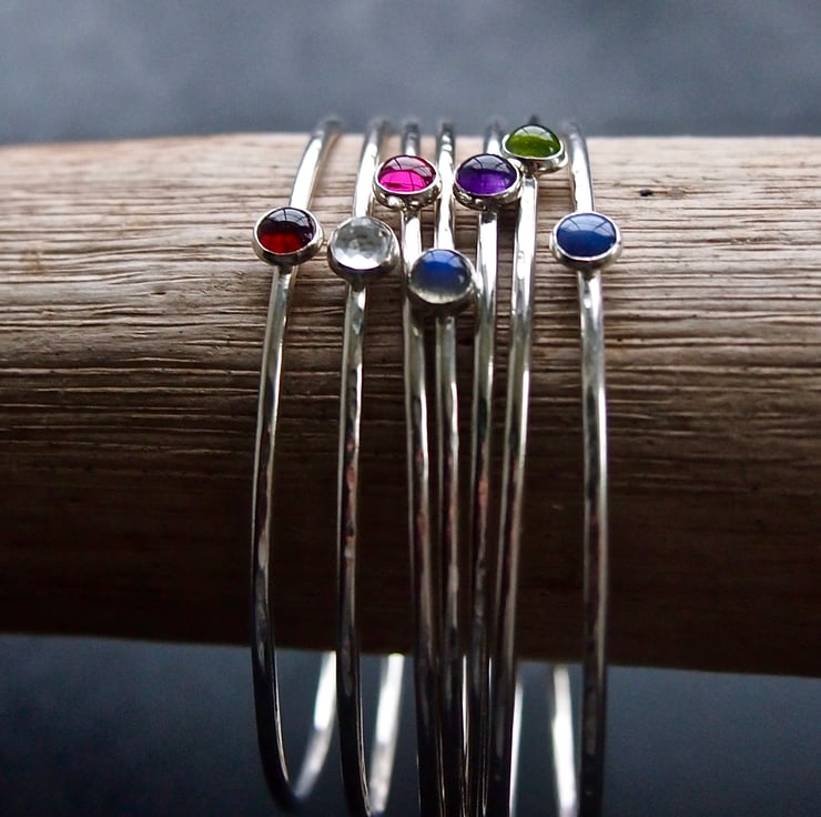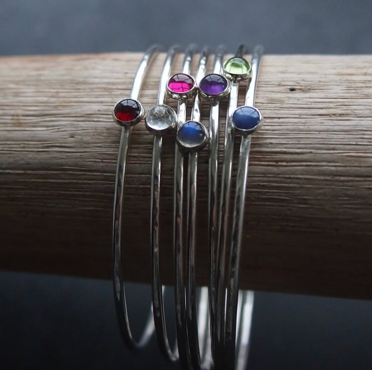 A hammered bangle (1.8mm) with a 5mm cabochon of your choice. If you don't see the stone that you would like please get in touch - we probably have it!