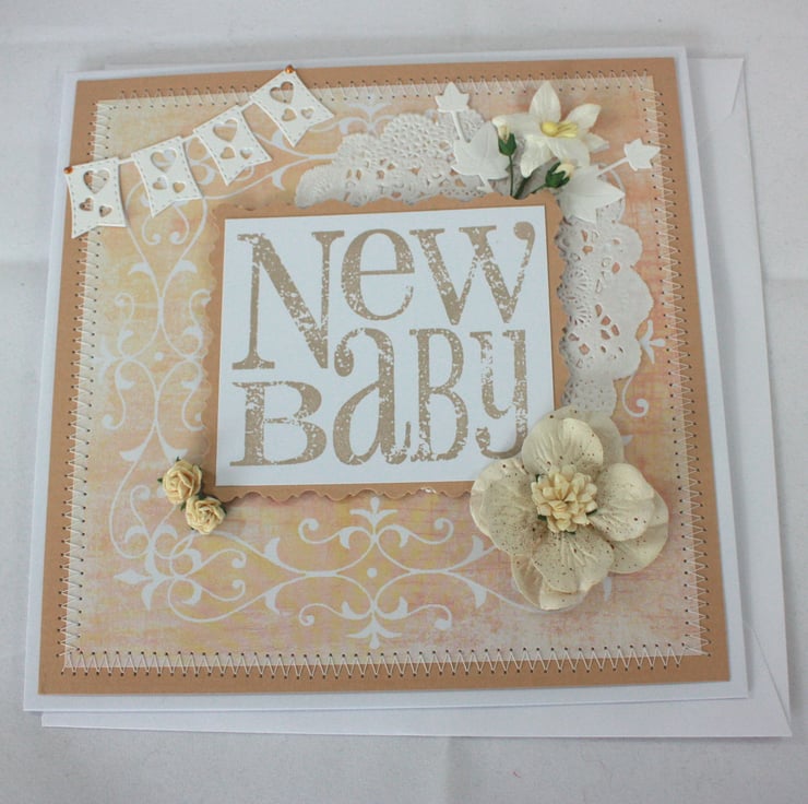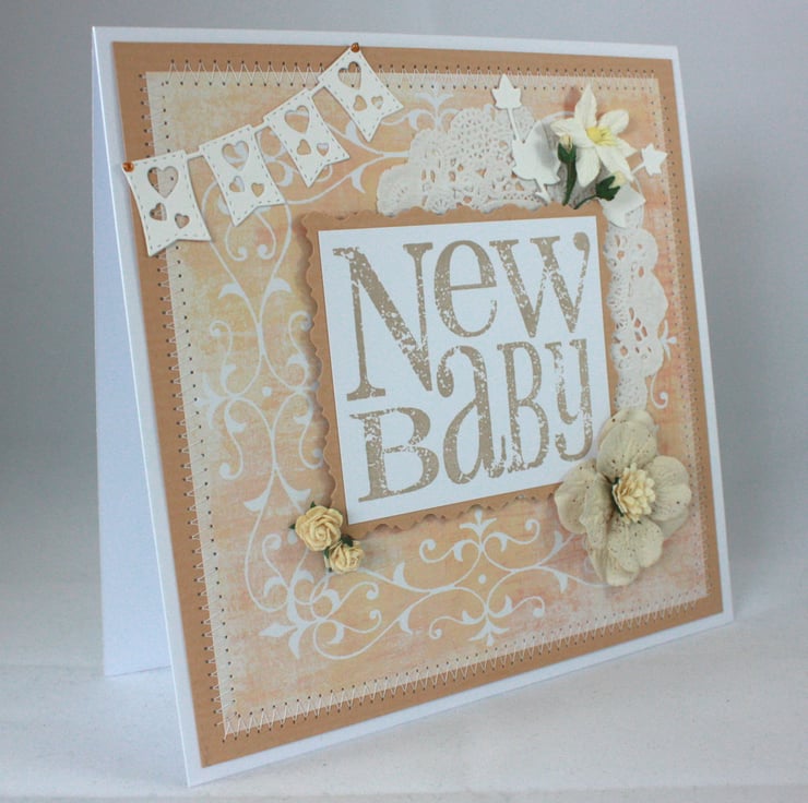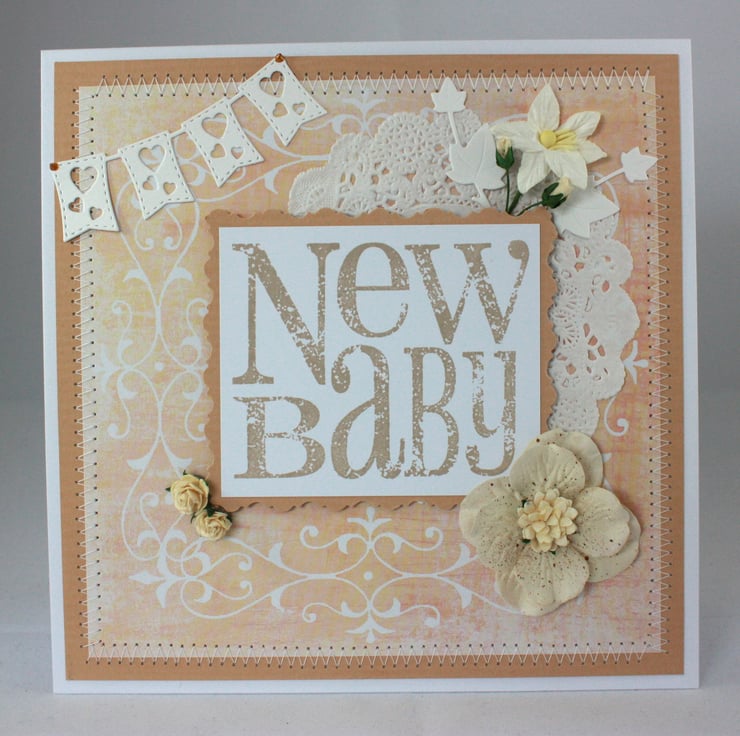 The card features the phrase 'New Baby' stamped and layered over patterned paper, stitched to a coffee coloured card. The card is embellished with die cut bunting and paper flowers.