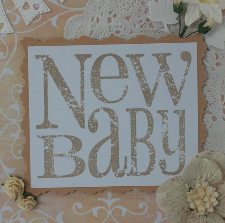 Large, square, neutral coloured, new baby card, suitable for babies of either sex.