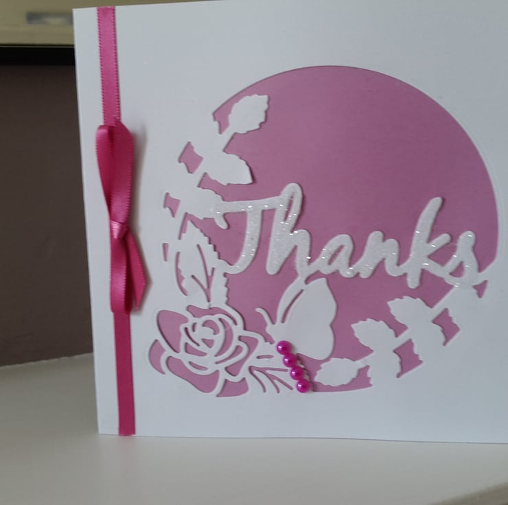 A completely handmade and uniquely designed card. Consisting of quality pristine white card which has been die cut into a pretty floral and butterfly design. The word thanks has been covered in fine white glitter. The body of the butterfly with co ordinating pink beads. Finished off with cerise satin ribbon and bow.