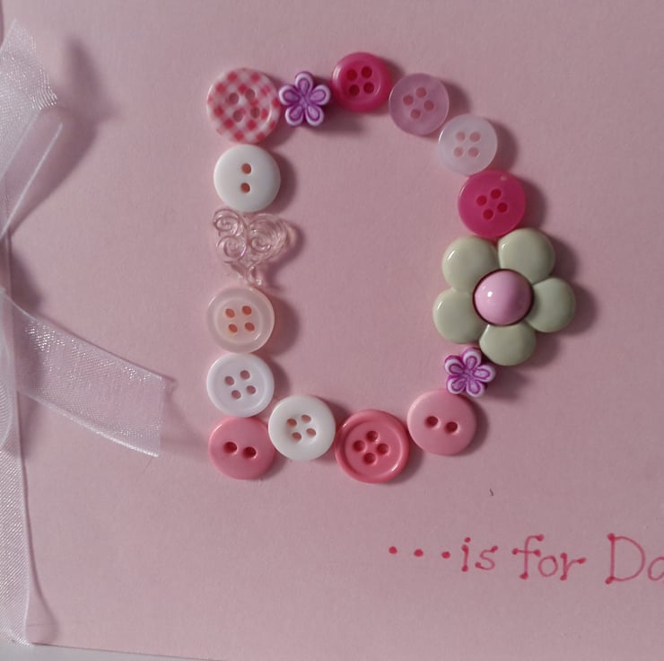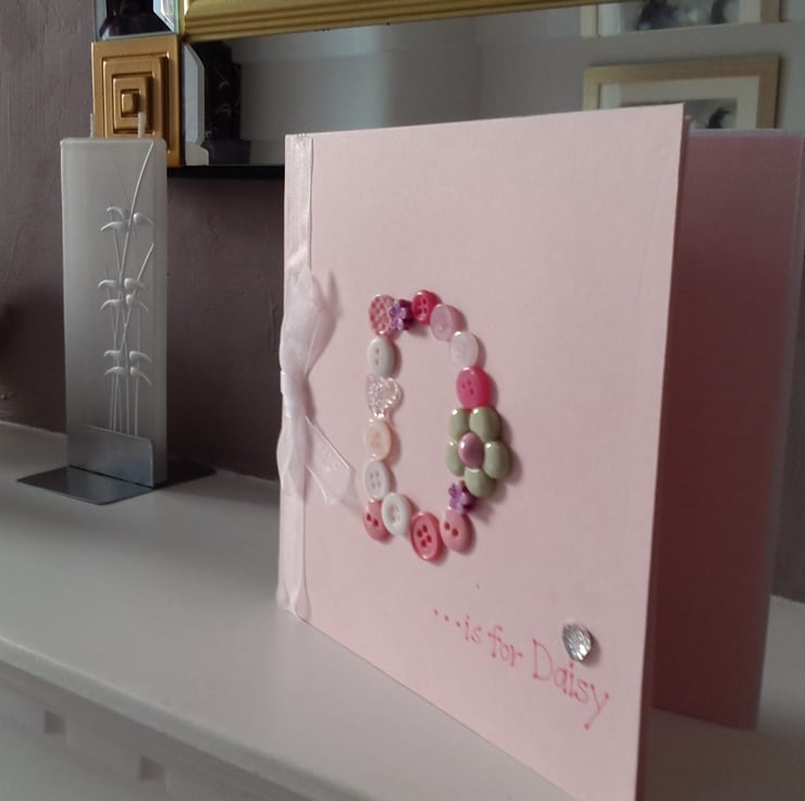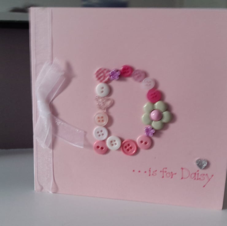 A completely handmade and uniquely designed card. Consisting of quality pristine white card which has been covered in pink card. This has been decorated with the little girls initial in co ordinating white and pink buttons with a larger Daisy button or whatever appropriate to match the name. Finished off with is for - Childs name handwritten in pink ink. Finished off finally with silver glitter heart and white organza ribbon and bow