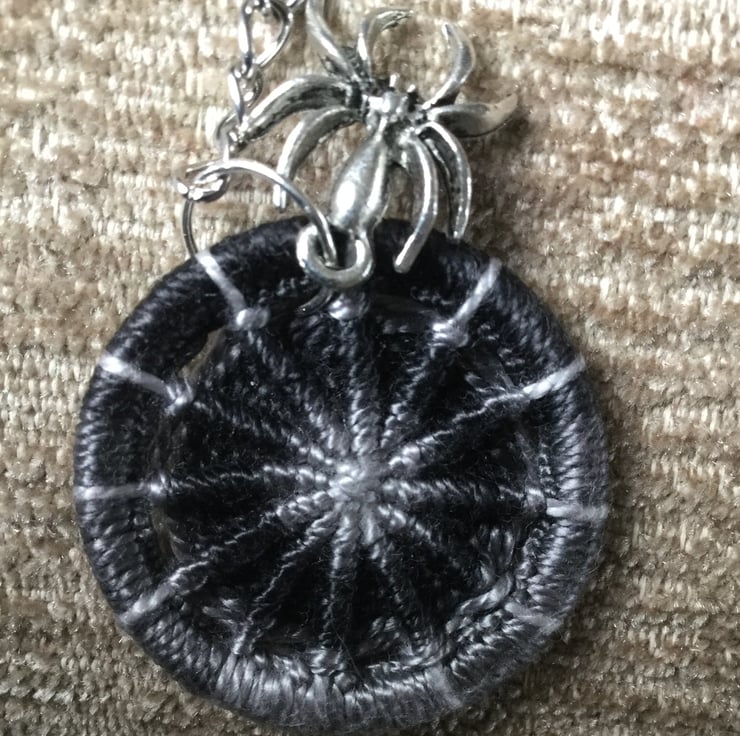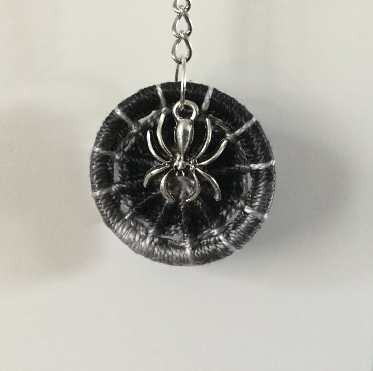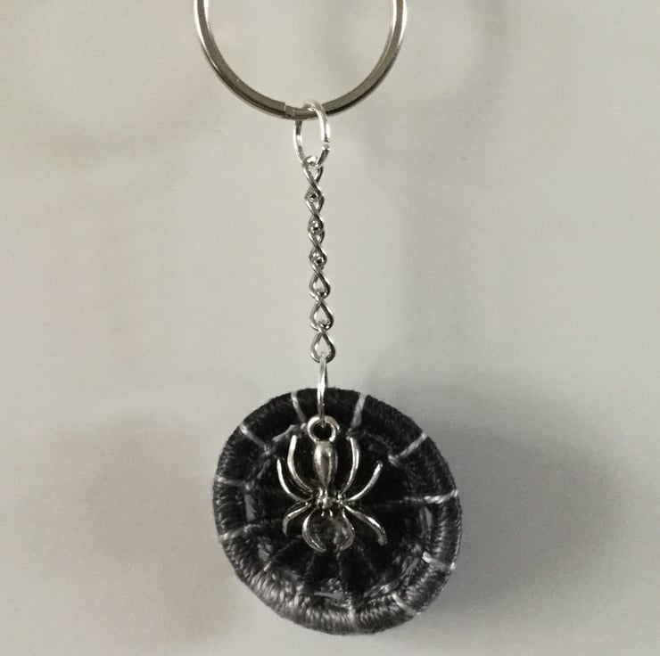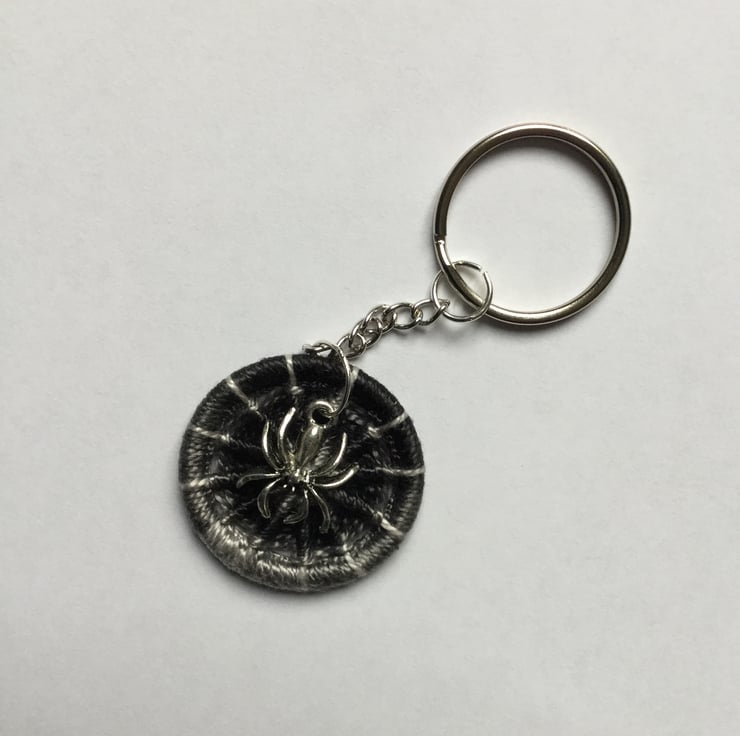 This spider keyring bag charm has a Dorset button which I have made with a shaded grey to black Perle thread on a 32mm brass ring finished off with a Tibetan silver spider charm hanging from a keychain.
