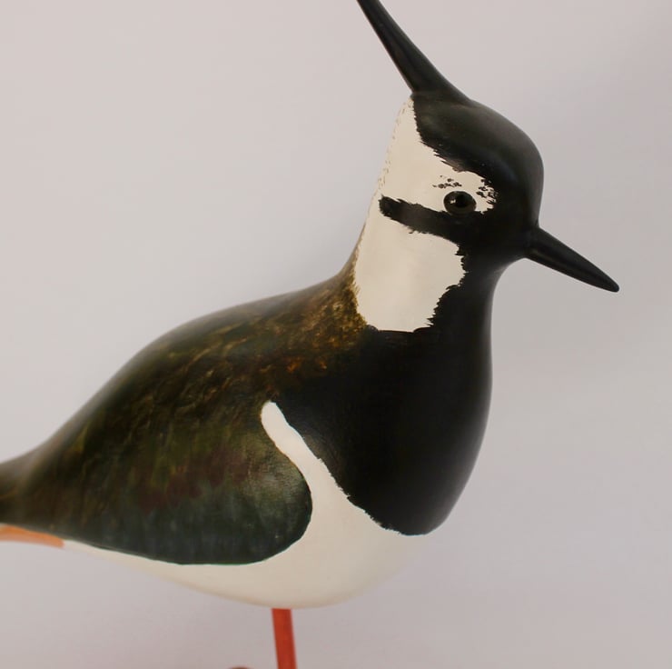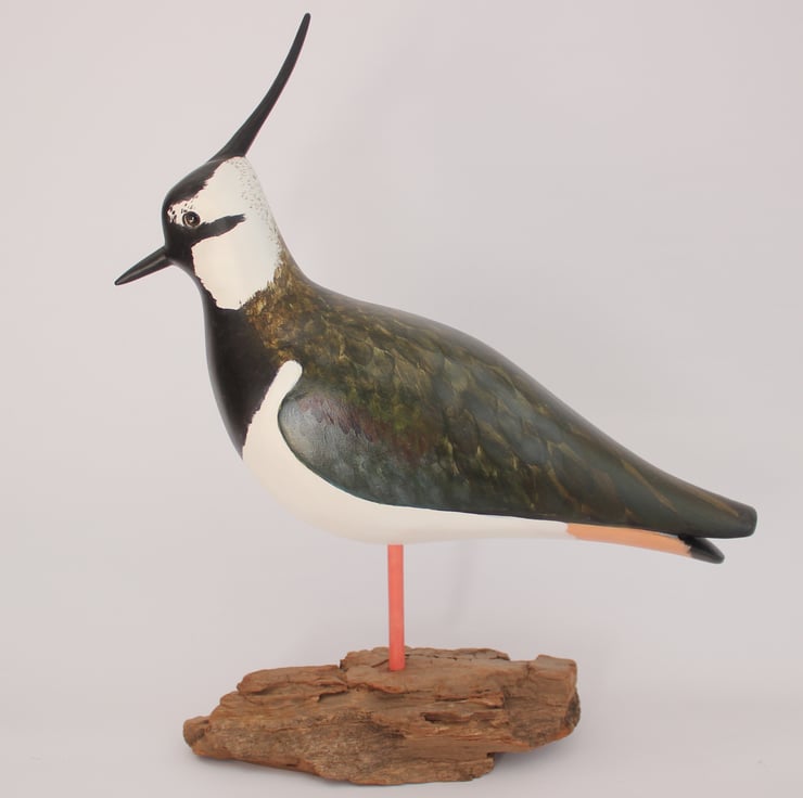 This large lapwing is hand carved, painted with acrylics and mounted on driftwood. It has hand tinted glass eyes and is finished to a soft shine with wax. It is 31cm tall, 27cm long and 8cm deep overall.