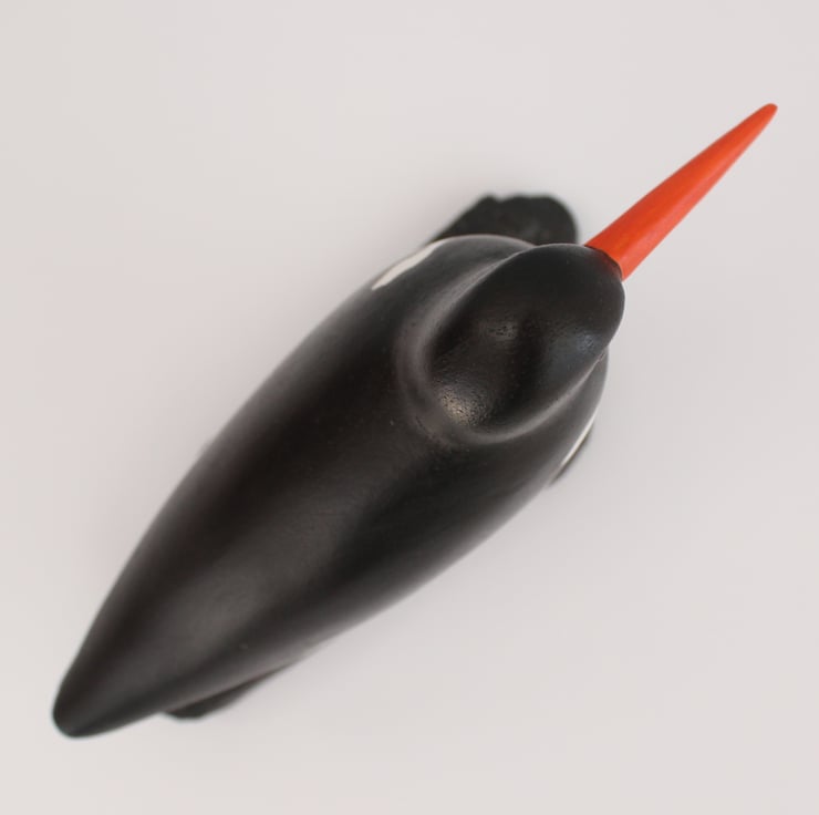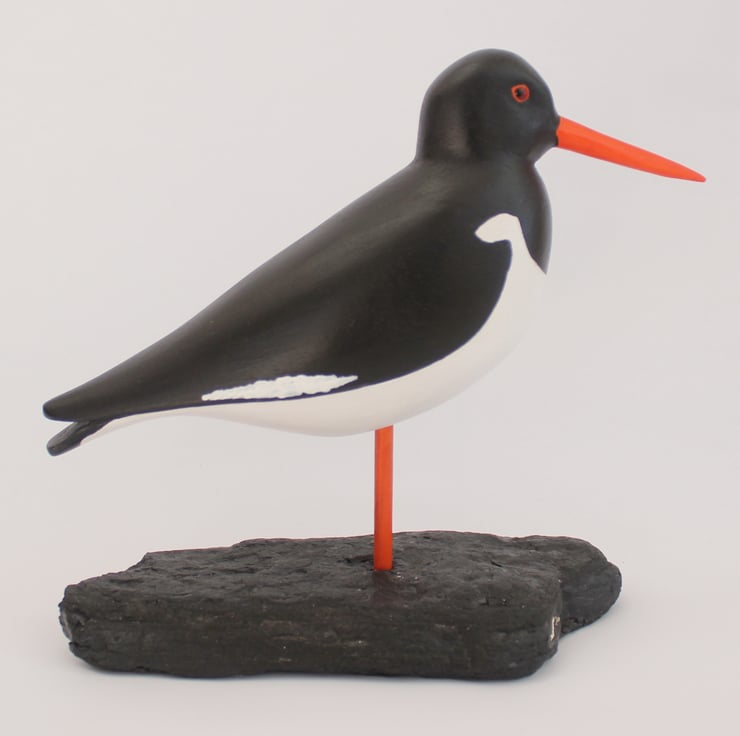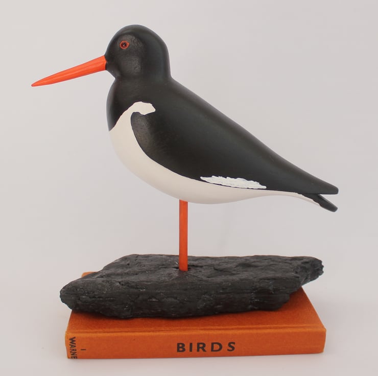 This oystercatcher is mounted on sea coal and the piece is 17cm tall, 17cm wide and 7cm deep overall. The bird is hand carved from wood and painted with acrylics. It has hand tinted glass eyes and is finished to a soft shine with wax.