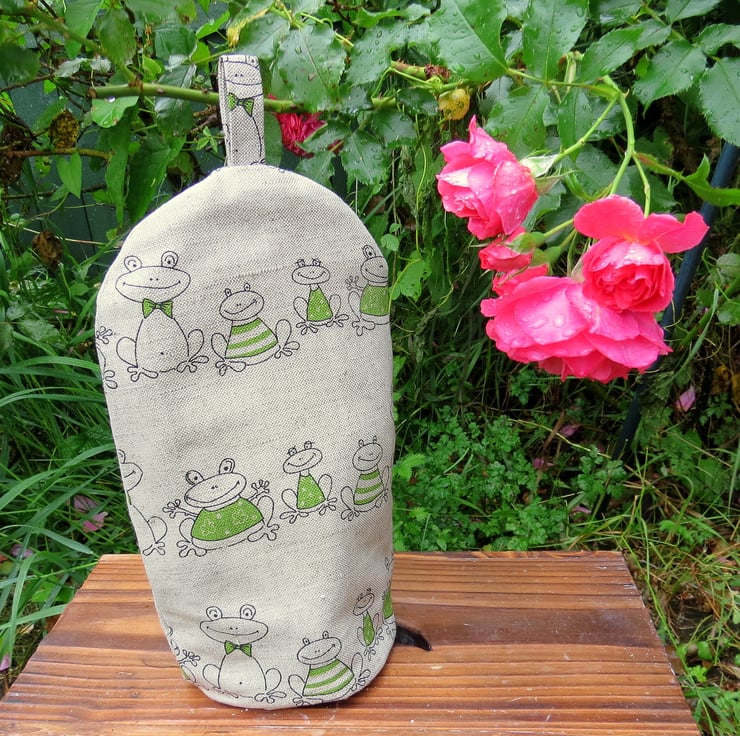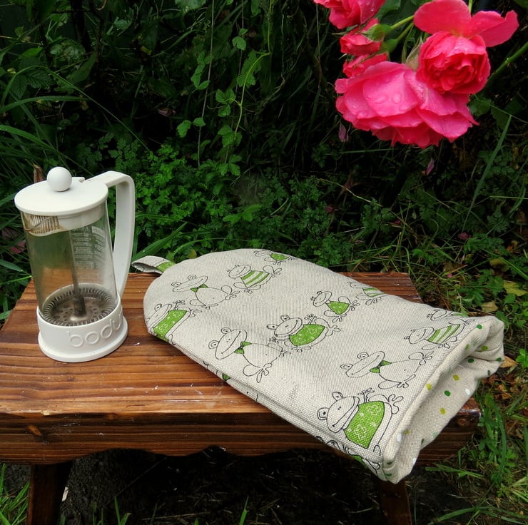 This is a cafetiere cosy with a whimsical frogs design.