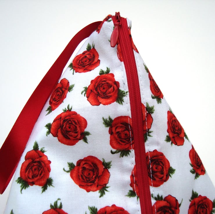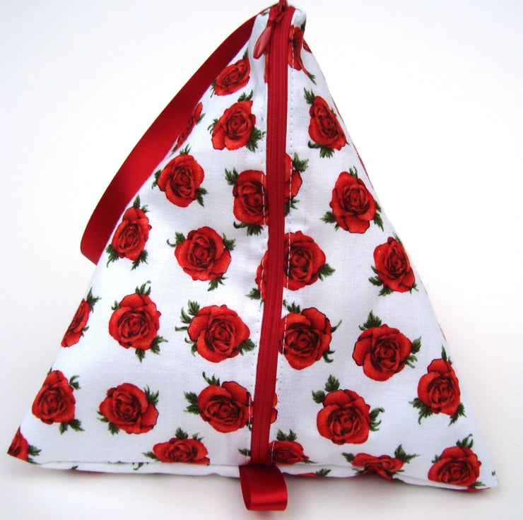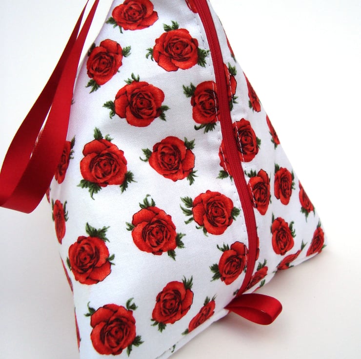 Sewn in beautiful designer fabric, these gorgeous Pyramid Project Bags measure 7" high x 7" wide. The cases are fully lined with a zip fastening closing and carry handle made from ribbon. They are able to hold a sock knitting project with Dpns and 100g of yarn or a small crochet project, yarn and hook. Also ideal as a makeup bag.