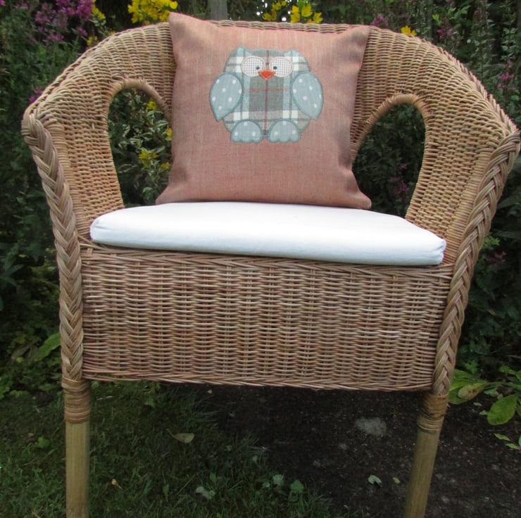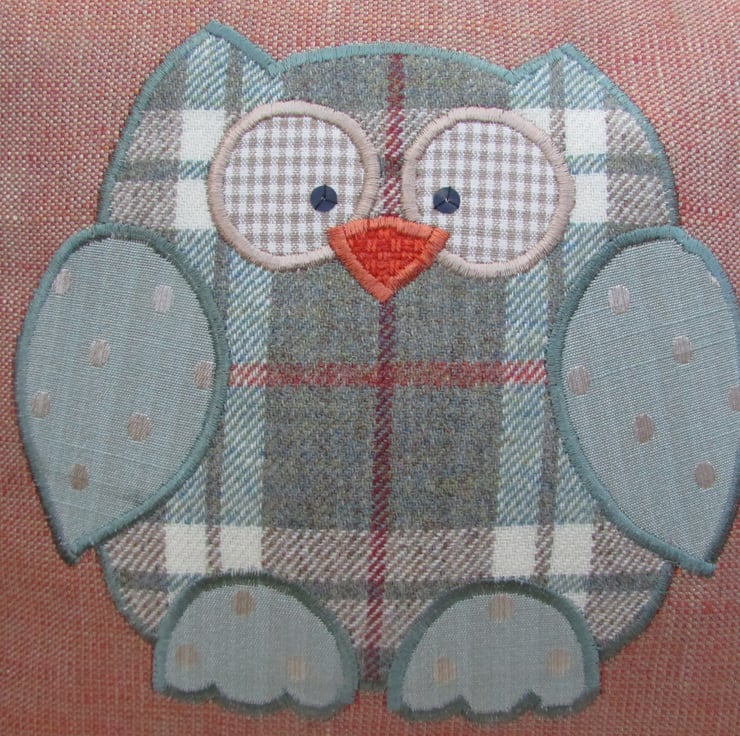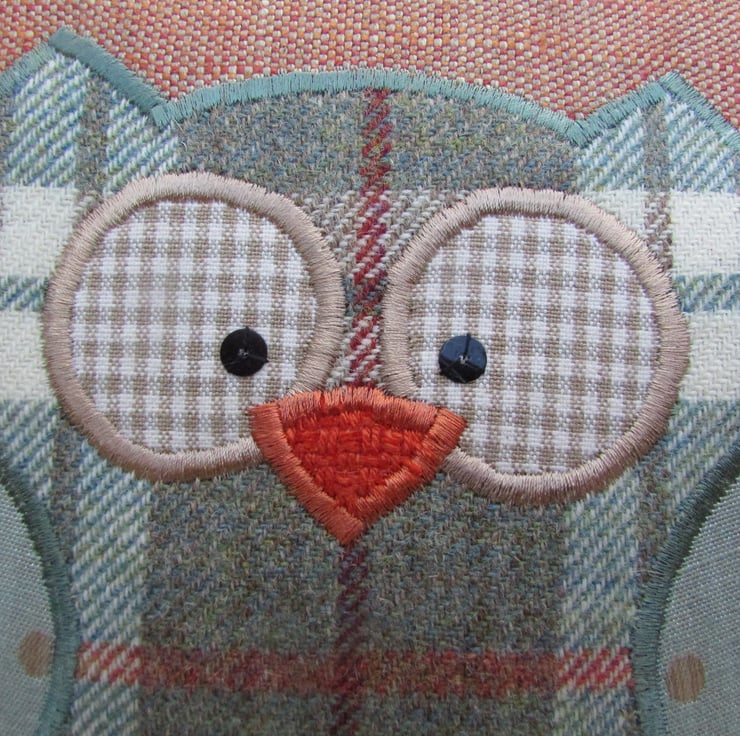A warm terracotta cushion with a cute applique owl. The body of the owl is a tweed check in shades of green, cream, beige, terracotta and burgundy. The wings and feet are green with a woven silver spot pattern. The beak is orange and the eyes are beige and cream gingham check embellished with black sequins.