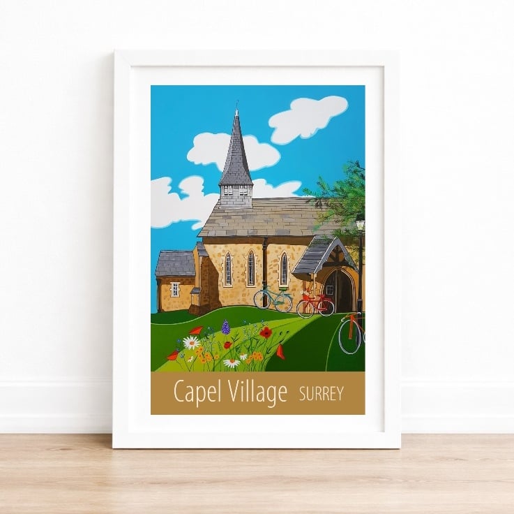A contemporary travel poster style print of St John The Baptist Church in the the pretty, and friendly, little village of Capel in Surrey, from my own original acrylic painting. A perfect gift for those who love Capel!