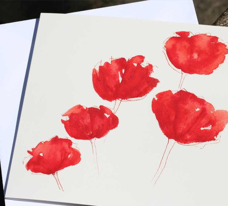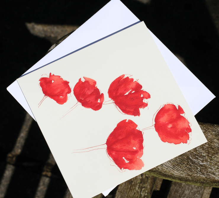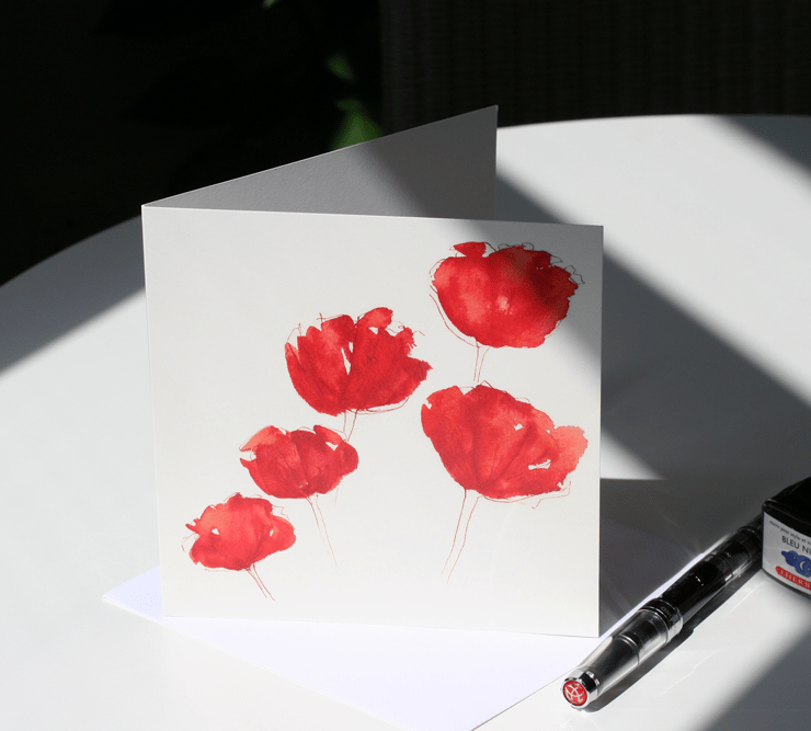 A single square card (148 x 148 mm) and envelope featuring vibrant poppies painted in a loose watercolour style and set on an ivory background.