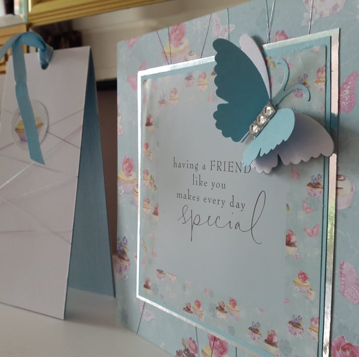 A completely handmade and uniquely designed card. Consisting of a friend sentiment on cupcake and butterfly patterned paper. Mounted on aqua card, silver miiri and then onto pretty patterned paper and then onto quality pristine white card. Finished off with a pretty butterfly with rhinestone body. A matching gift tag with cupcake decoration and ribbon tie