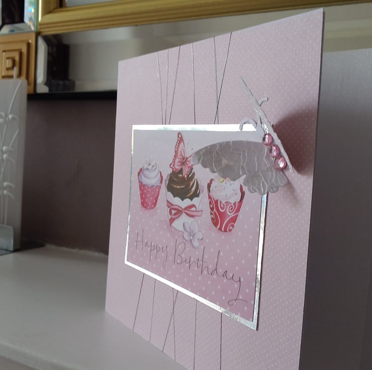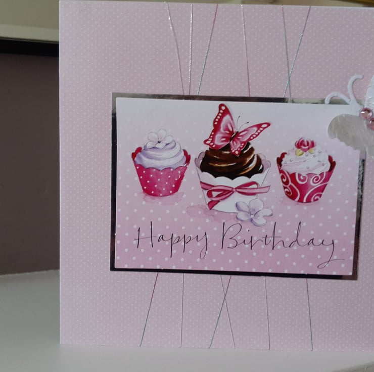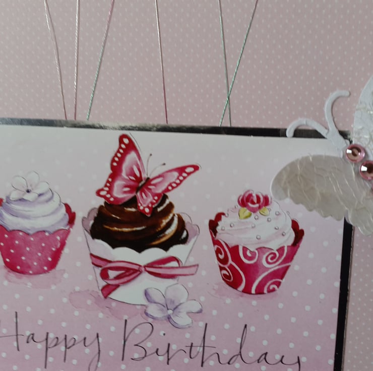 A completely handmade and uniquely designed card. Consisting of a trio of cupcakes with happy birthday sentiment mounted onto silver Morris card then onto pink/white dotty paper and then onto quality pristine white card. Finished off with holographic twine and a white/spiders web die cut butterfly with pink rhinestone body.