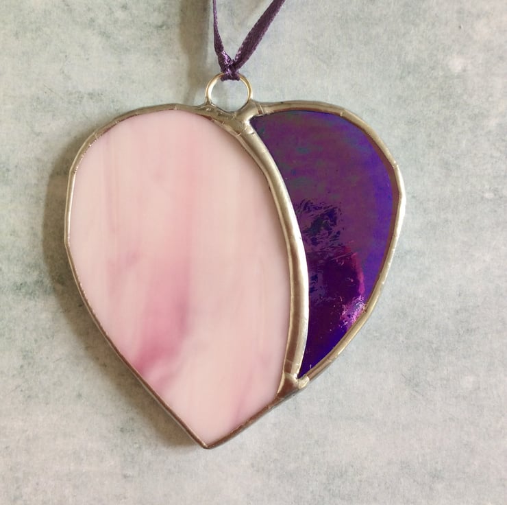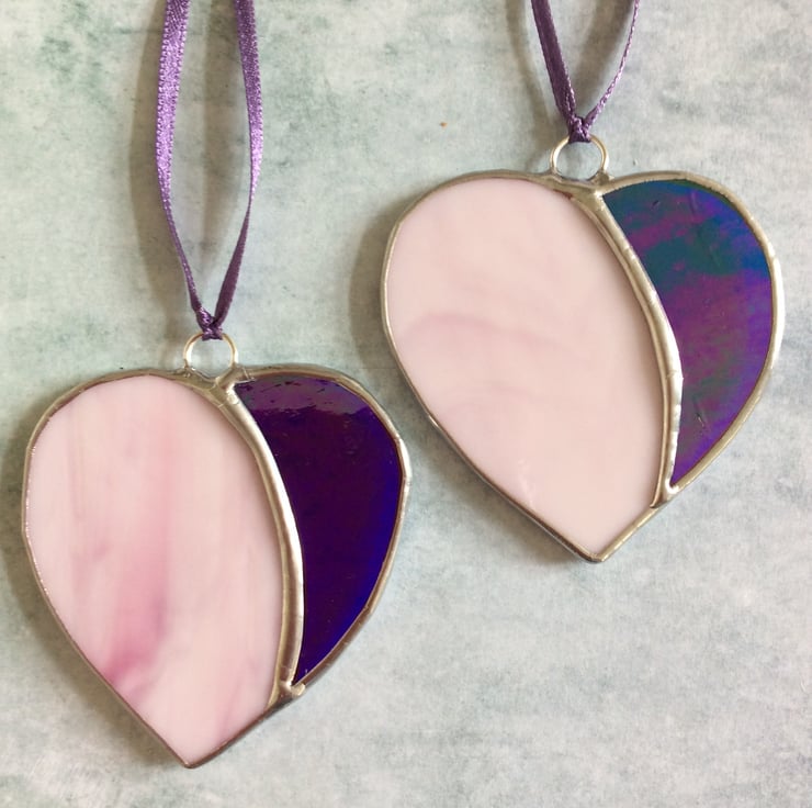 A pair of decorative hanging hearts cut from opal pink glass and irridised blue transparent glass . Each heart measures approximately 65mm diameter and they hang from purple ribbon loops .